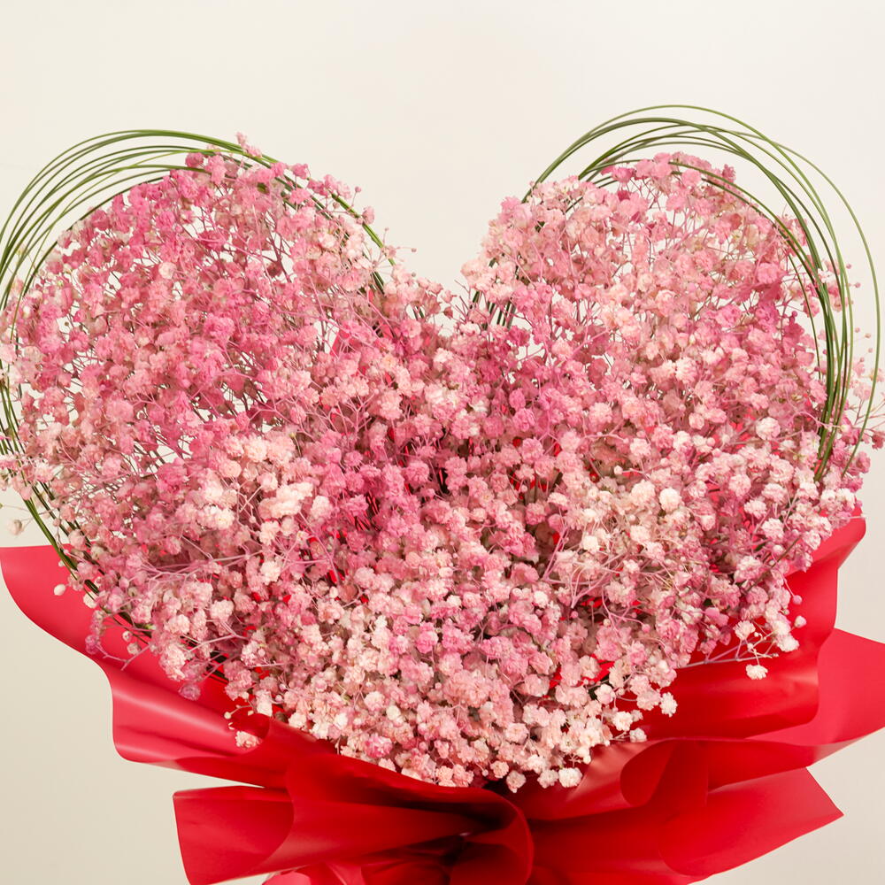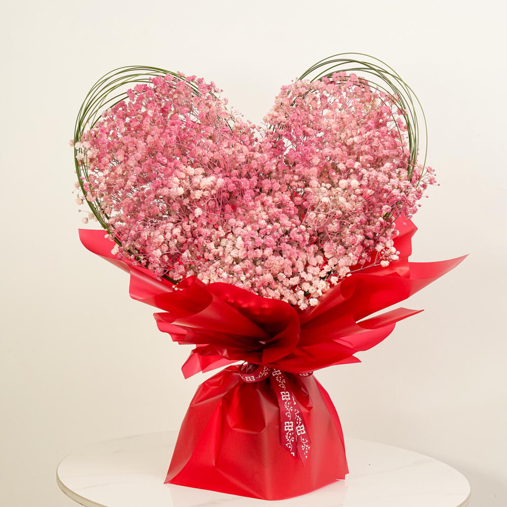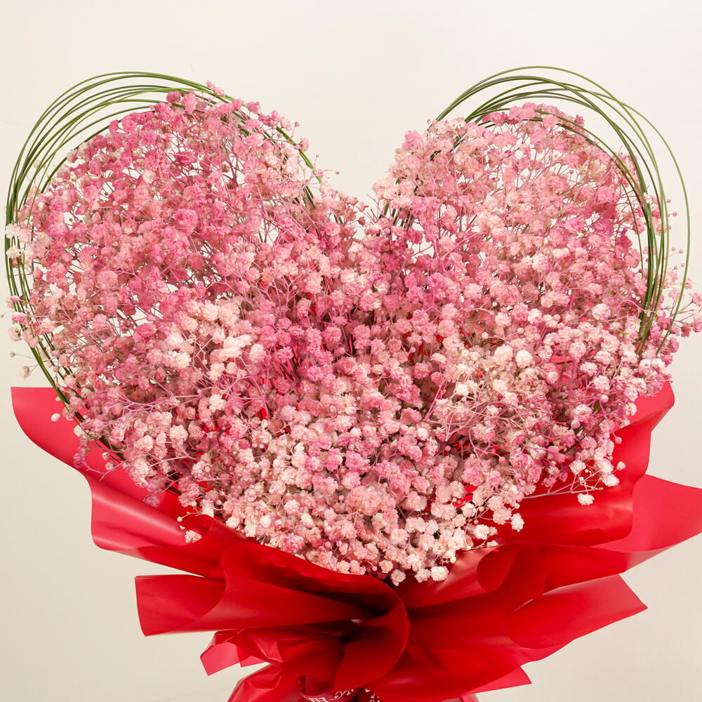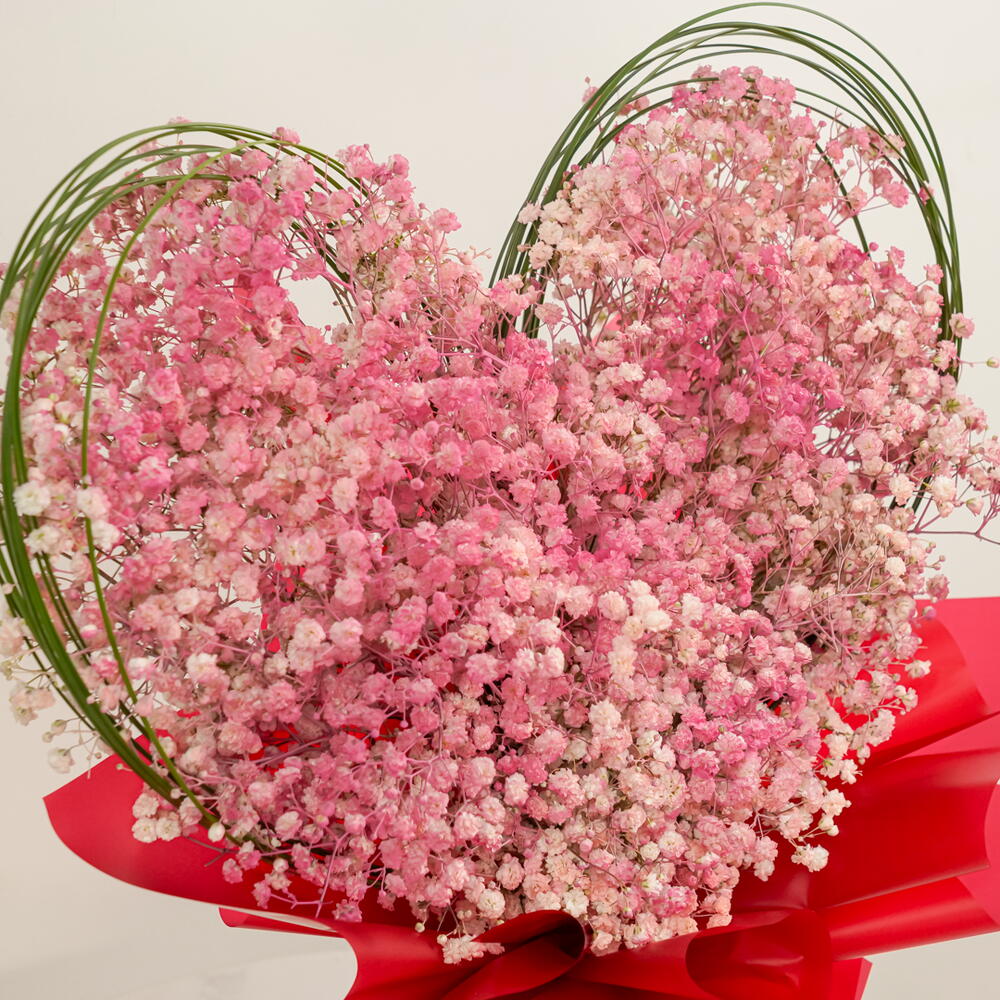 Букет “Heart of Grace” выполнен в уникальной форме сердца, содержит 20 розовых гипсофил и 10 стелл-грасс, элегантно завернут в ярко-красную упаковку. Романтический подарок, символизирующий любовь и красоту.