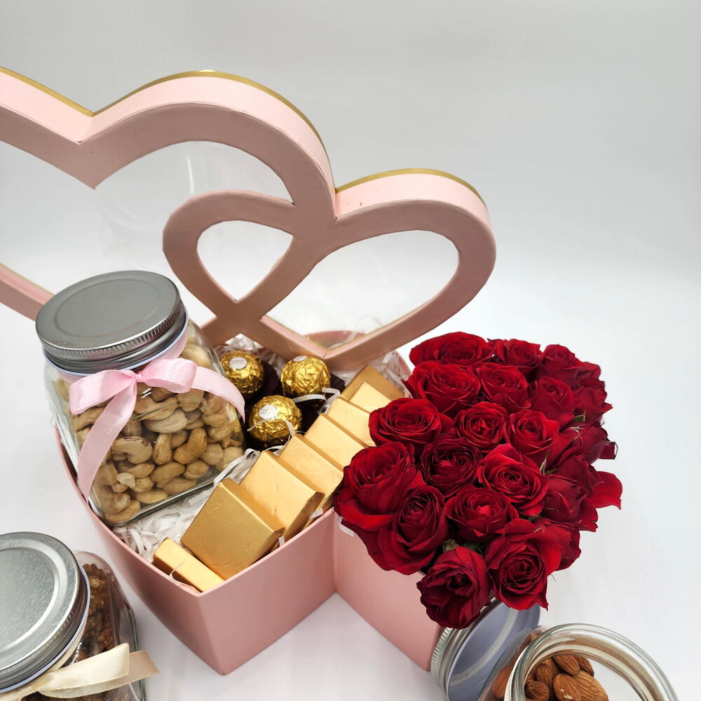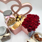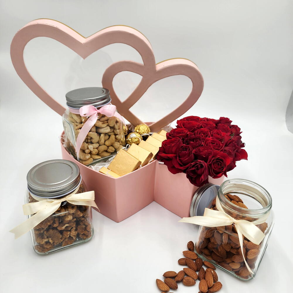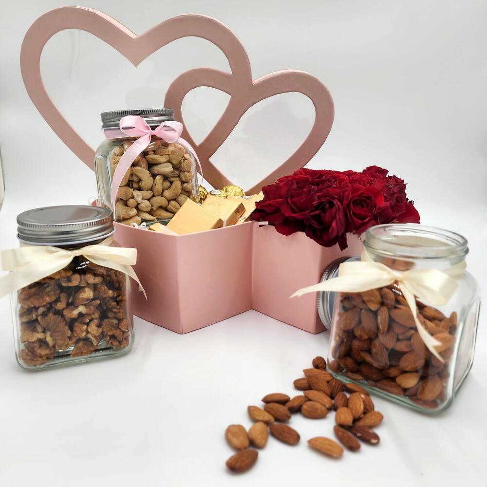 ferrero rocher chocolates - 4 шт. свежая молодая роза красная - 6 шт. банка кешью - 500 граммов - 1 шт. банка миндаля - 500 граммов - 1 шт. банка грецких орехов - 500 г - 1 шт. ле шоколад - 8 шт.