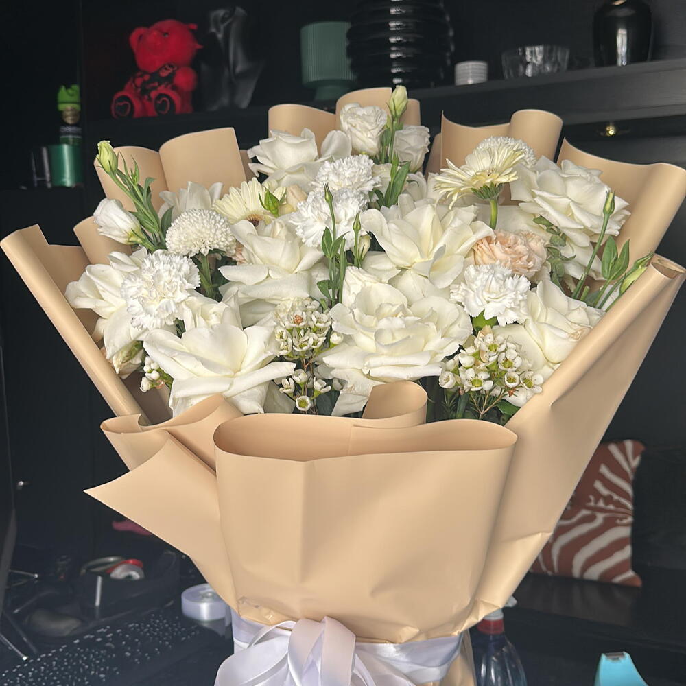 Eustoma - 4 шт. Gerbera - 2 шт. carnation - 4 шт. ping pong - 2 шт. wax - 3 шт. white roses - 10 шт.