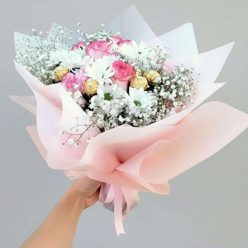 Этот очаровательный букет представляет собой очаровательное сочетание нежно-розовых роз, белых хризантем и нежных гипсофил. Дополнение в виде шоколадных конфет Ferrero Rocher в золотой обертке станет приятным сюрпризом и прекрасным подарком на особые случаи, такие как дни рождения, годовщины или просто романтический жест. Упакованный в нежно-розовую бумагу с лентой, букет излучает элегантность и нежность, идеально поддерживая любовь и признательность. Празднуете ли вы любовь или просто хотите порадовать кого-то, этот букет – идеальное сочетание красоты и нежности. Регулярно меняйте воду и подрезайте стебли примерно на 1 см каждые несколько дней, чтобы цветы дольше оставались свежими. Храните букет в прохладном месте, защищенном от прямых солнечных лучей, для оптимальной сохранности.