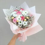 Gypsophila - 2 шт. white chrysanthemum - 2 шт. pink carnation - 2 шт. ферреро роше - 6 шт. роза джумилия - 4 шт.