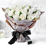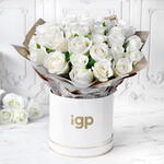 Нежные и чистые, белые розы — воплощение истинной красоты, и если дарить их в количестве 25 штук, они, как известно, передают пожелания всего счастья на свете. Собранные вместе в роскошной крафтовой коробке нашего фирменного чёрного цвета, букет из белых роз станет отличным поздравительным подарком
