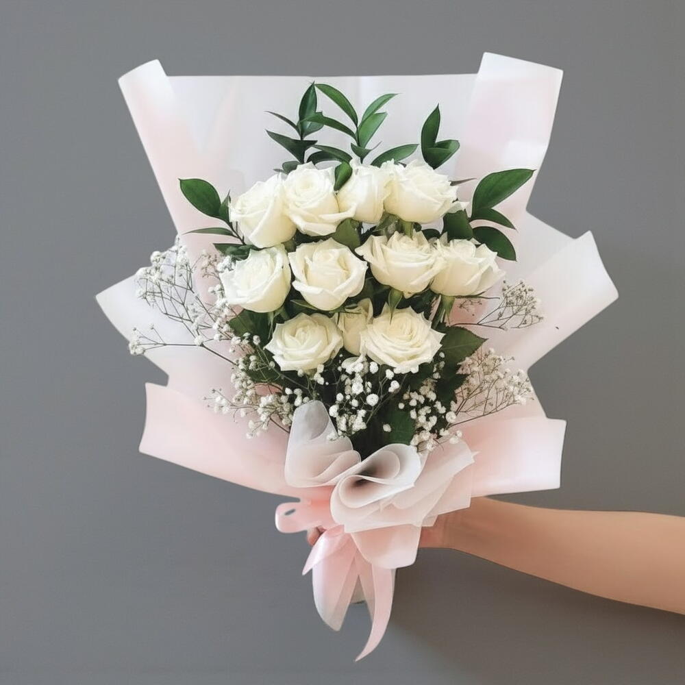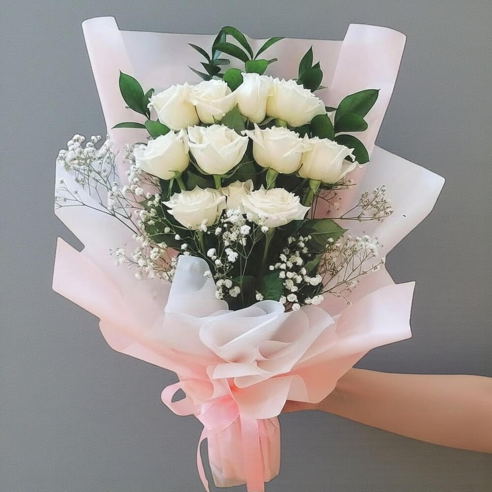 Этот элегантный букет включает 11 безупречных белых роз, символизирующих чистоту, любовь и восхищение. Нежные белые розы красиво дополняют деликатная гипсофила и свежая зелень, создавая легкий и воздушный образ. Обёрнутый в мягкую розовую тишью и перевязанный лентой, букет излучает изящество и очарование, что делает его идеальным подарком на свадьбу, годовщину или любой случай, когда вы хотите выразить восхищение или привязанность. Простой, но изысканный дизайн делает его вечным проявлением любви. Для ухода регулярно меняйте воду и подрезайте стебли примерно на 1 см каждые пару дней, чтобы розы оставались свежими. Храните букет в прохладном месте, вдали от прямых солнечных лучей, чтобы сохранить его красоту.