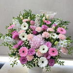 hydrangea pink - 1 шт. carnation pink - 10 шт. lisianthus pink - 7 шт. gerbera pink - 5 шт. зелёный лист - 6 шт. белая гербера - 5 шт. маттиола белая - 5 шт. белый тюльпан - 5 шт.