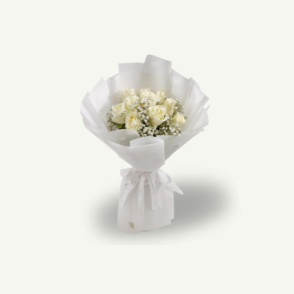 Букет, связанный вручную, из 10 свежих белых роз и нежной гипсофилы, аккуратно оформлен в элегантную белую упаковку для вневременного и изящного вида.