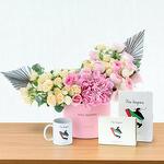 pink hydrangea - 1 шт. ветки эвкалипта - 3 шт. pink roses - 9 шт. белые спрей-розы - 5 шт. персиковые спрей-розы - 5 шт. расписанные вручную сухие листья - 2 шт. “ты вдохновляешь” керамическая кружка - 1 шт. “ты вдохновляешь” дневник - 1 шт. коробка премиального шоколада из наследственных сортов какао - 1 шт.