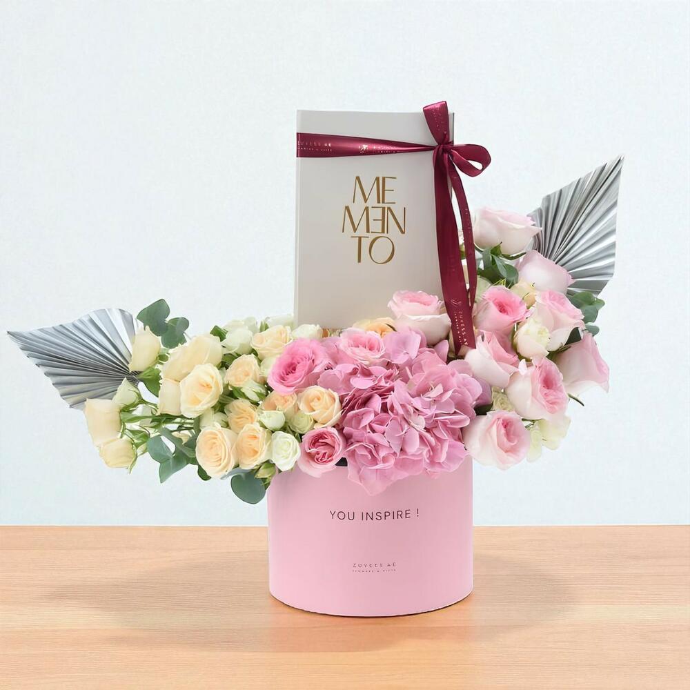 Eucalyptus - 3 шт. pink hydrangea - 1 шт. pink roses - 13 шт. белые спрей-розы - 7 шт. персиковые спрей-розы - 7 шт. сухие серебряные листья - 2 шт. ваучер memento experience - 1 шт.
