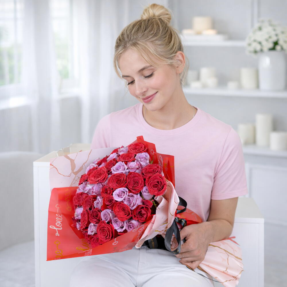 red roses - 26 шт. roses - 51 шт. фиолетовые розы - 25 шт.