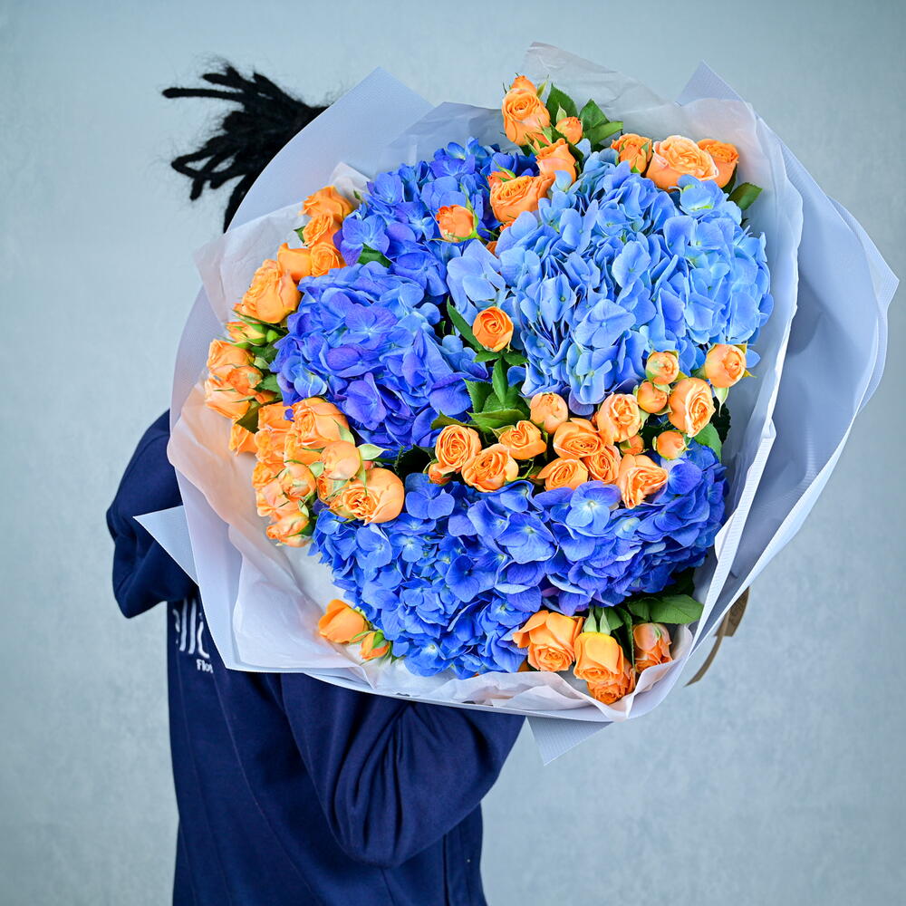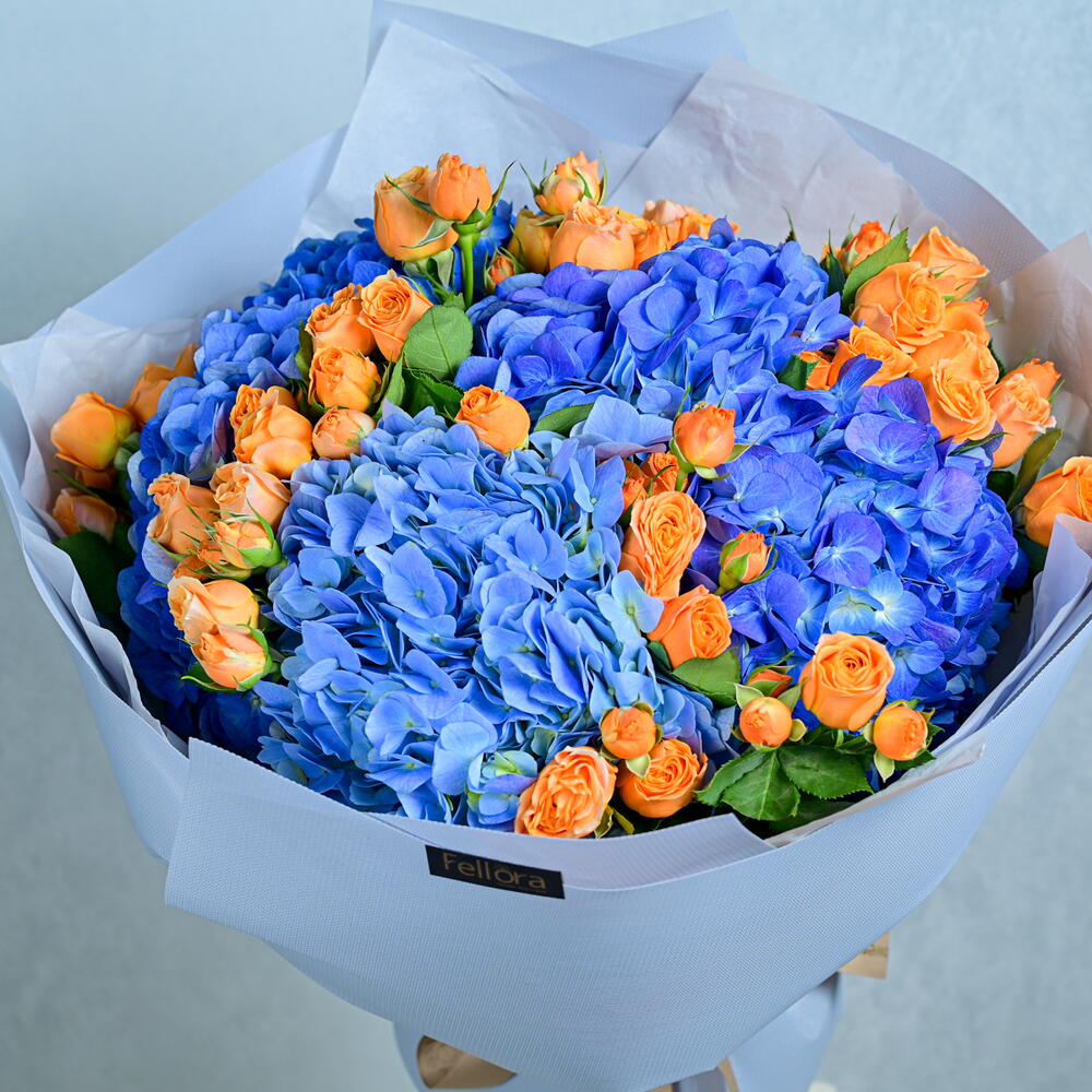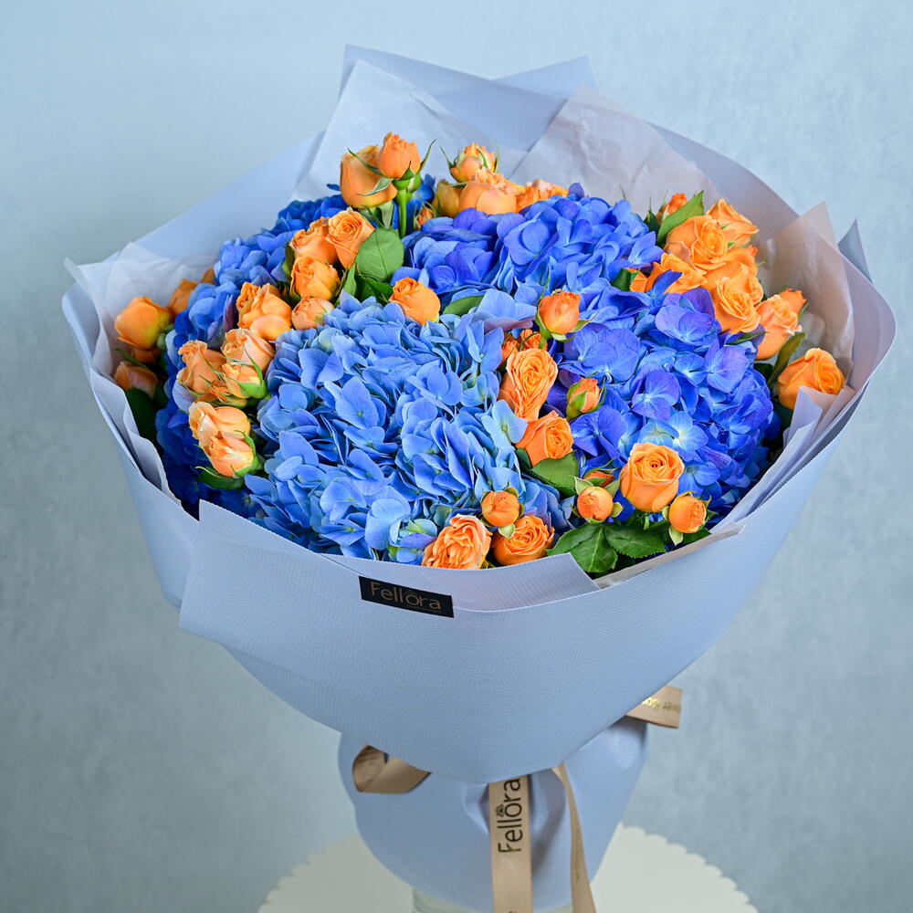 Почувствуйте тепло и яркость заката с нашим букетом «Сияние заката». Эта сияющая композиция представляет собой потрясающее сочетание синей гортензии и оранжевых кустовых роз, создавая идеальную гармонию цветов, которая передает красоту заката. В состав букета входят: 5 синих гортензий, 9 оранжевых кустовых роз и 6 декоративных упаковок. Описание: Насыщенные оттенки синих гортензий в сочетании с яркими оранжевыми кустовыми розами делают этот букет ярким выбором для любого случая. Отмечаете ли вы день рождения, годовщину или просто делаете трогательный жест, букет «Сияние заката» украсит любой день своими яркими красками и элегантной подачей. В цветочном бутике Fellora мы гордимся тем, что используем только самые свежие цветы, чтобы ваша композиция оставалась яркой и красивой в течение нескольких дней. Поделитесь теплом и очарованием нашего букета «Сияние заката» с кем-то особенным или побалуйте себя восхитительным цветочным подарком!