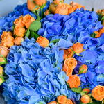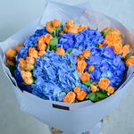 Ribbon - 1 шт. blue hydrangea - 5 шт. оранжевые спрей-розы - 9 шт. украшение упаковки - 6 шт.