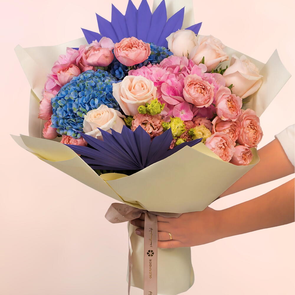 Lisianthus - 2 шт. rose - 5 шт. hydrangea pink - 2 шт. hydrangea blue - 2 шт. джулиата - 4 шт. вашинтонио - 2 шт.