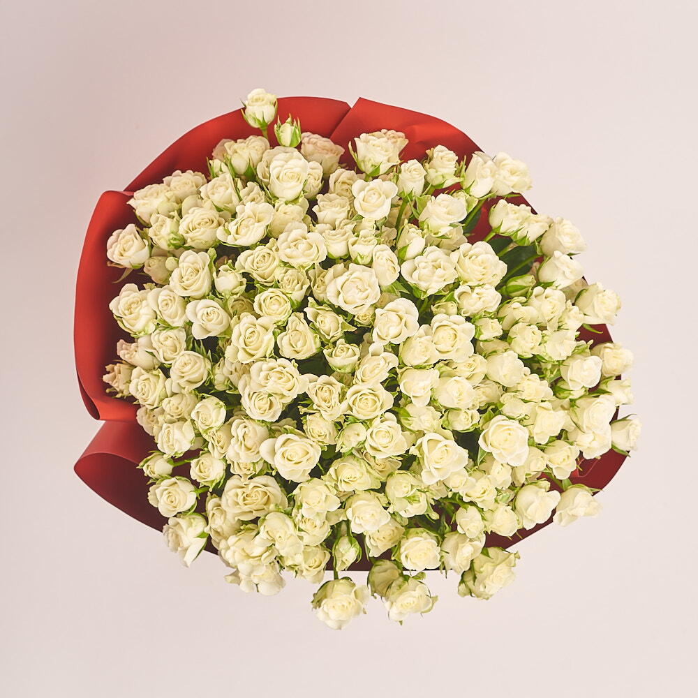 Эффектный и элегантный букет из 51 белой кустовой розы, красиво оформленный и упакованный в эффектную красную обертку премиум-класса, создающую драматичный и привлекательный вид. На каждом стебле множество нежных бутонов, образующих пышную и воздушную композицию, излучающую изысканность. Идеально подходит для свадеб, юбилеев, поздравлений или в качестве трогательного жеста в адрес любимого человека. Белые кустовые розы символизируют чистоту, мир и новые начинания, а красная обертка добавляет нотку страсти и элегантности, делая этот букет незабываемым и искренним подарком. 🤍❤️