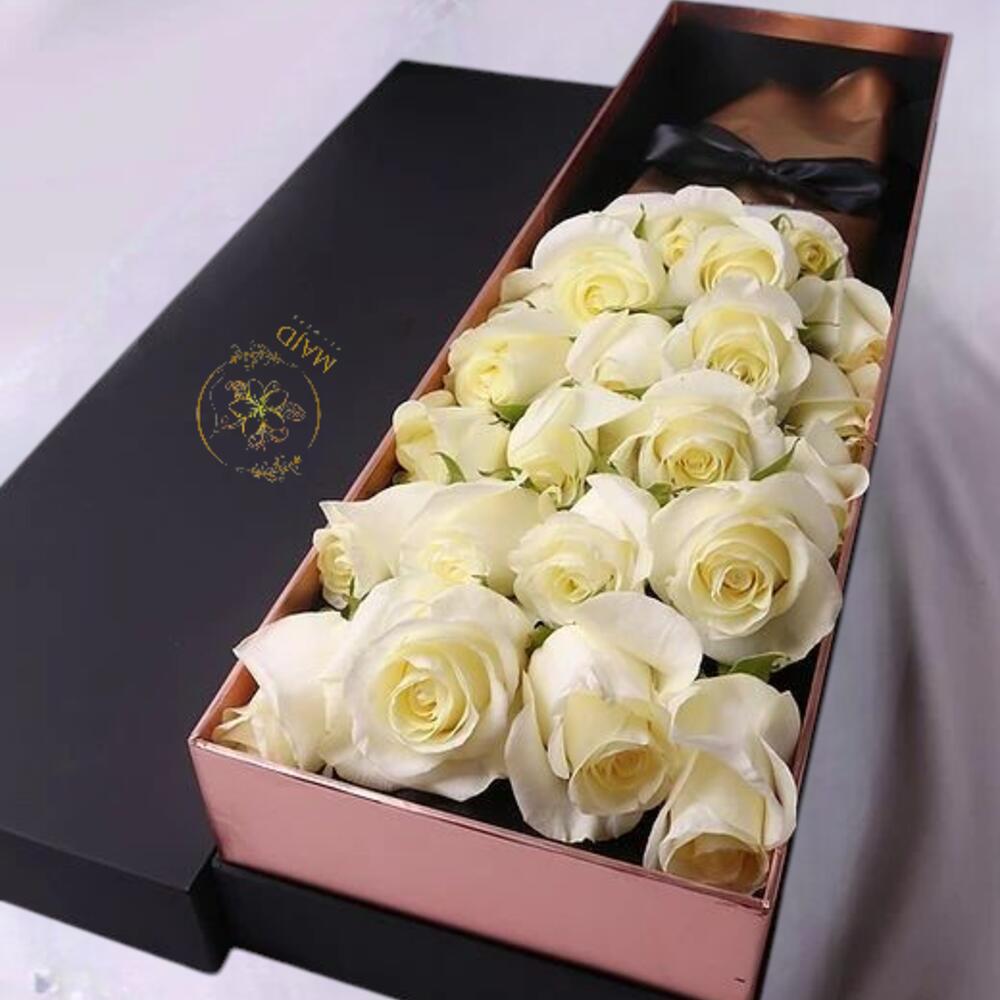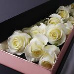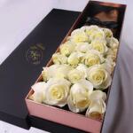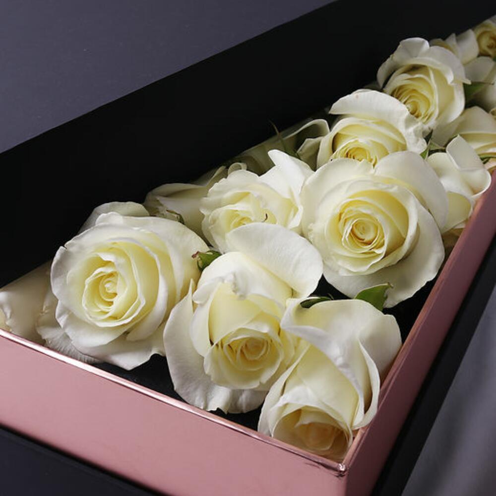 Роскошная коробка из 30 премиальных кремово-белых роз, красиво оформленных и обёрнутых в мягкую серую бумагу с изящной чёрной сатиновой лентой. Помещённая в матовую чёрную подарочную коробку с акцентом из ленты, эта композиция — идеальный символ чистоты, элегантности и вечной любви. Идеально для свадеб, в знак соболезнования, годовщин или когда вы просто хотите сказать «вы важны».