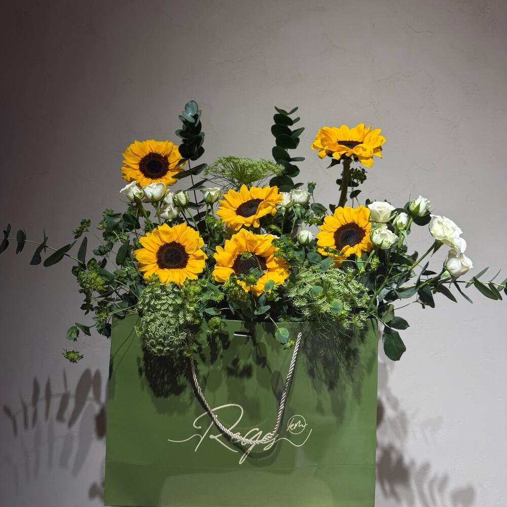 Почувствуйте очарование нашей эксклюзивной композиции Florists Special – очаровательной композиции из 6 солнечных подсолнухов, элегантно оттенённых 6 девственно-белыми розами. Естественная красота этого букета подчёркивается изысканной сложностью трёх ароматных эвкалиптов. Контрастные фактуры шести стеблей трахелиума придают букету неповторимую индивидуальность. Композиция упакована в красивый мешочек, что делает её идеальным подарком. Это изобилие природной красоты воплощает идеальную гармонию и передаёт роскошь, заботу и любовь к природе. Отмечаете ли вы особое событие или просто хотите оживить интерьер, этот букет обязательно произведёт впечатление и добавит нотку элегантности.