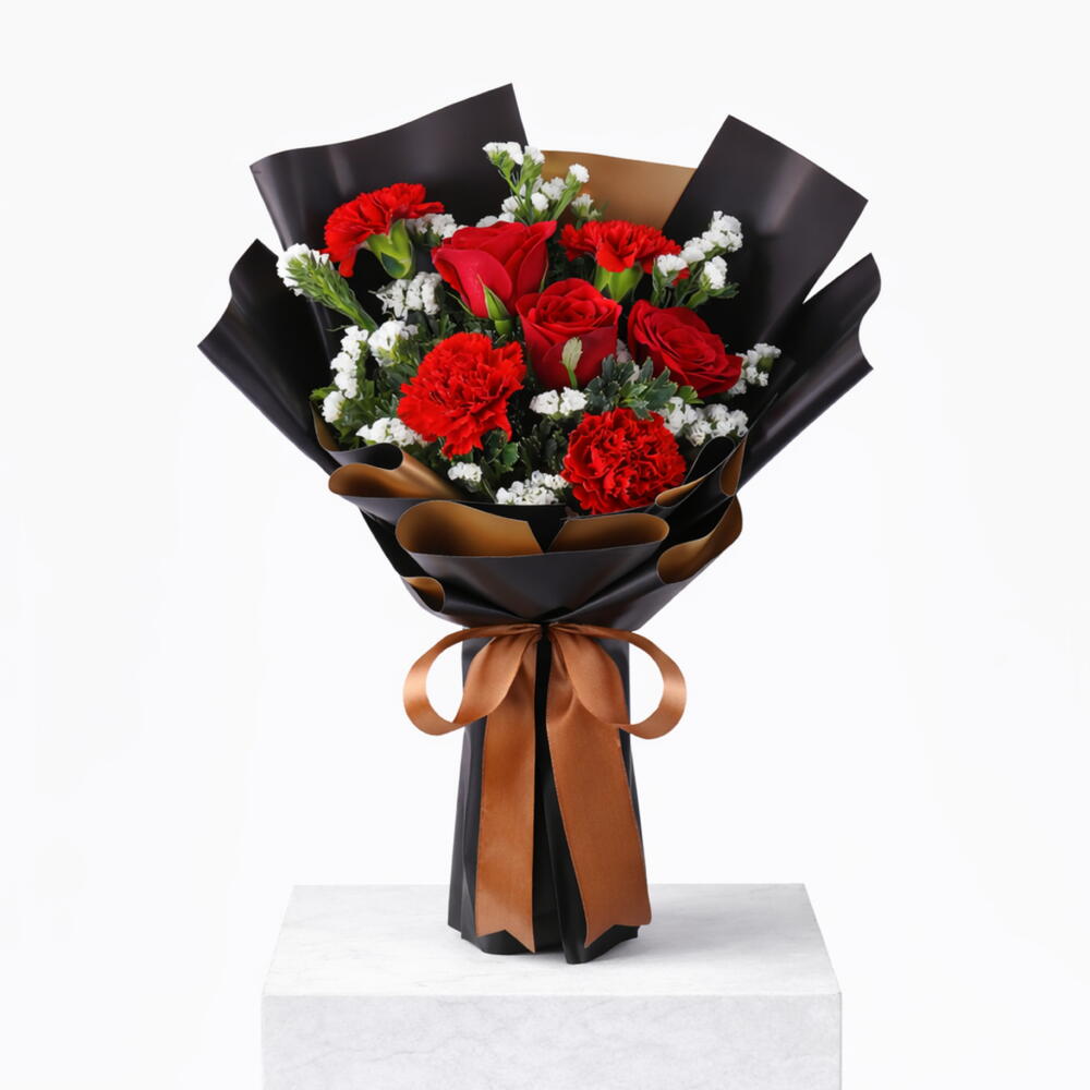 Red roses paired with red carnations for gothic glamour. Red Rose 3 Stems, Red Carnation 4 Stems, White Statis 2 Stems, Parvifolia 3 Stems