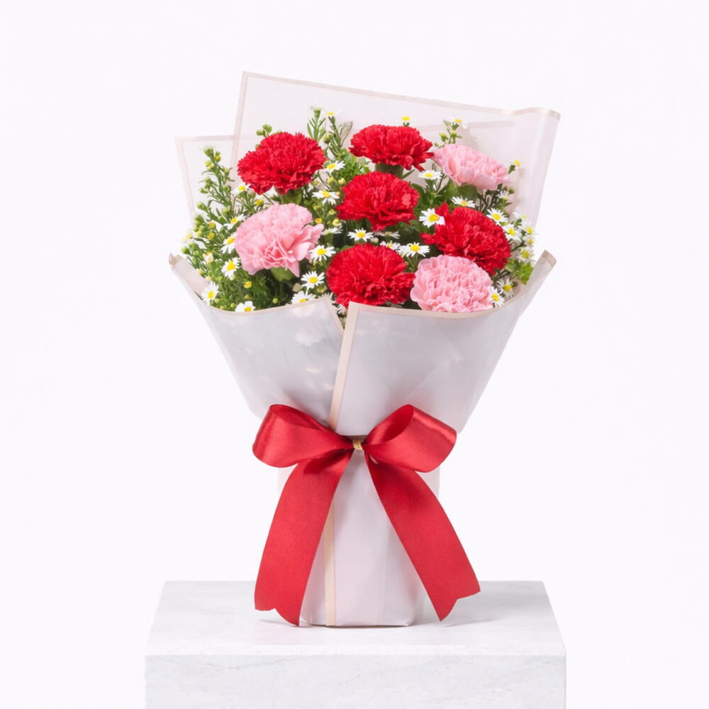 Bold red carnations with dark foliage — classic, spirited, and full of character. Red Carnation 5 Stems, Pink Carnation 3 Stems, Camomile 2 Stems