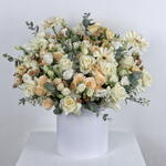 Огромная роскошная осенняя коробка с розами и мини-розами в насыщенных белых и персиковых оттенках с узнаваемой герберой, а также с красивыми натурально выглядящими сантини и ромашками с ароматом эвкалипта, красиво оформленная внутри огромной белой коробки, наполненной прекрасными цветами в красивых осенних тонах в подарок тому, кого вы любите и кто вам дорог. Ваше сердце