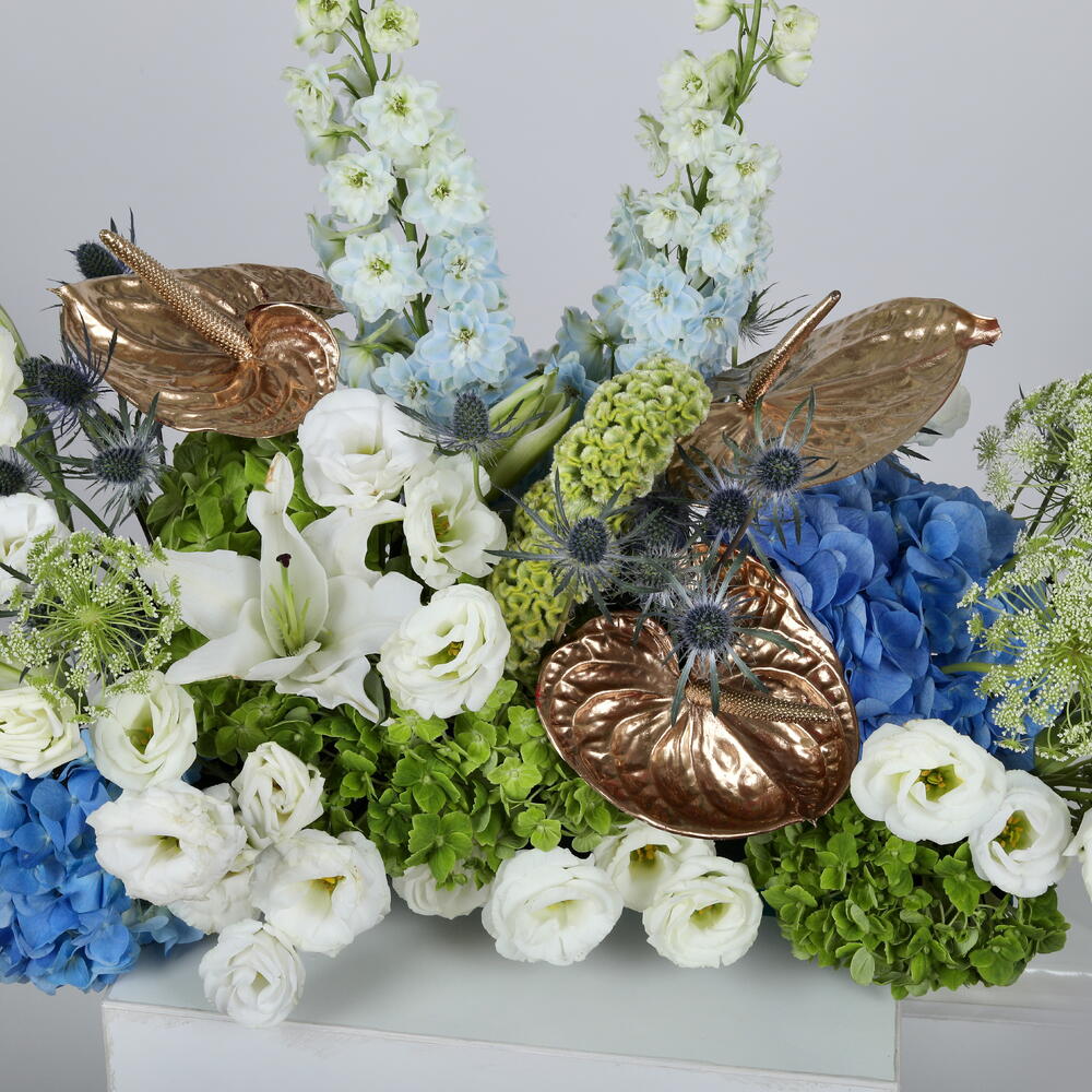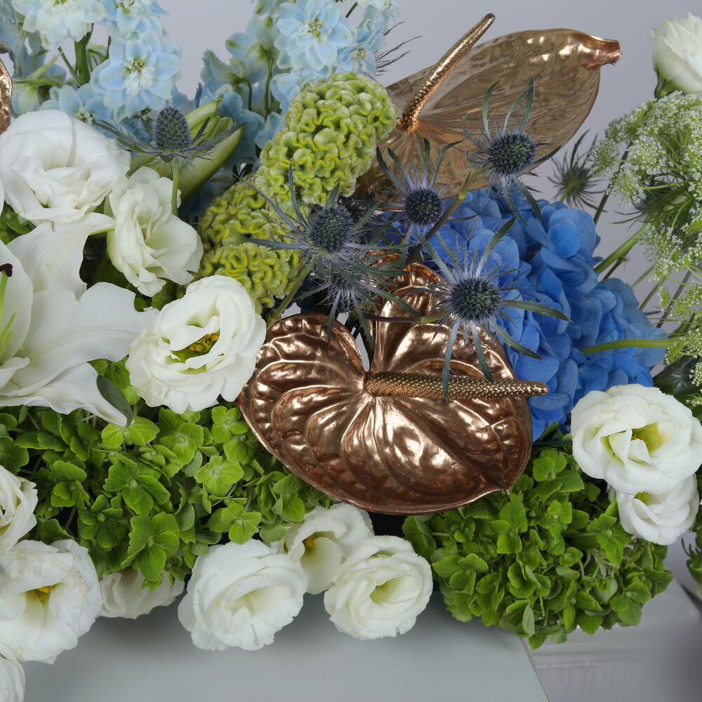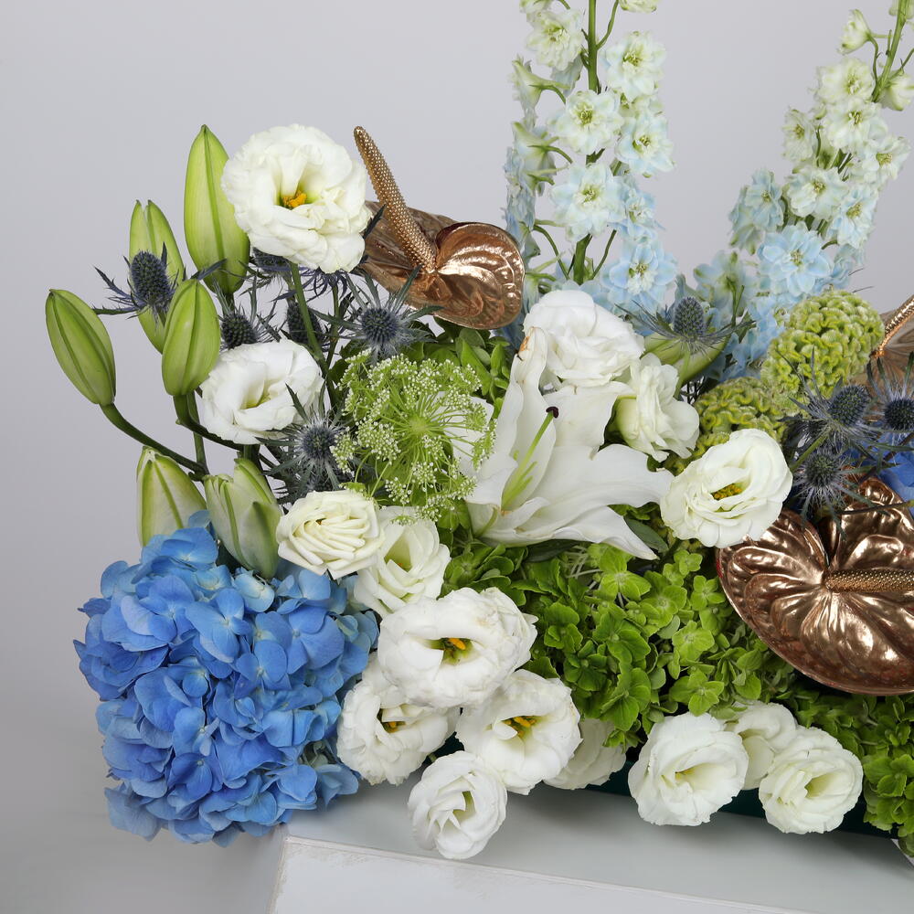 Изысканное сочетание голубой гортензии, белых восточных лилий, дельфиниума, эустомы, целозии, розово-золотого антуриума, эрингиума и амми мажус. Выполненная в спокойных голубых и белых тонах с роскошными текстурами, эта композиция создаёт утончённый, элегантный образ — идеально подходит для премиального подарка и элитного декора.
