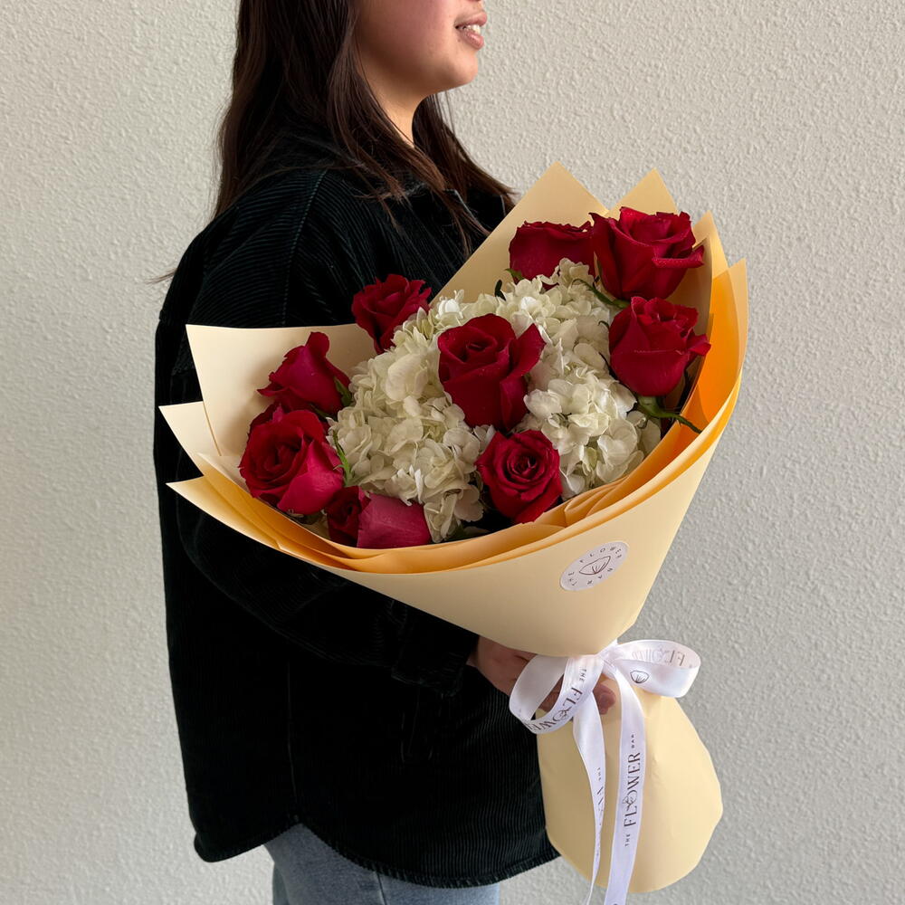 Почувствуйте очарование этой изысканной цветочной композиции, великолепно подобранной Florists Specials. Композиция из девяти сияющих красных роз, идеально сочетающихся с нежным спокойствием двух белых гортензий, несомненно, станет прекрасным выражением ваших чувств. Изящно упакованная в изысканный подарочный пакет, эта восхитительная коллекция цветов станет идеальным выражением любви, восхищения и уважения. Эта симфония цвета и аромата гарантированно оставит неизгладимое впечатление.