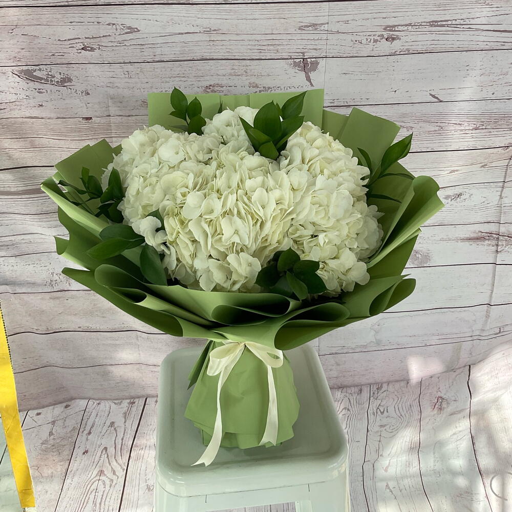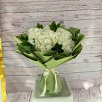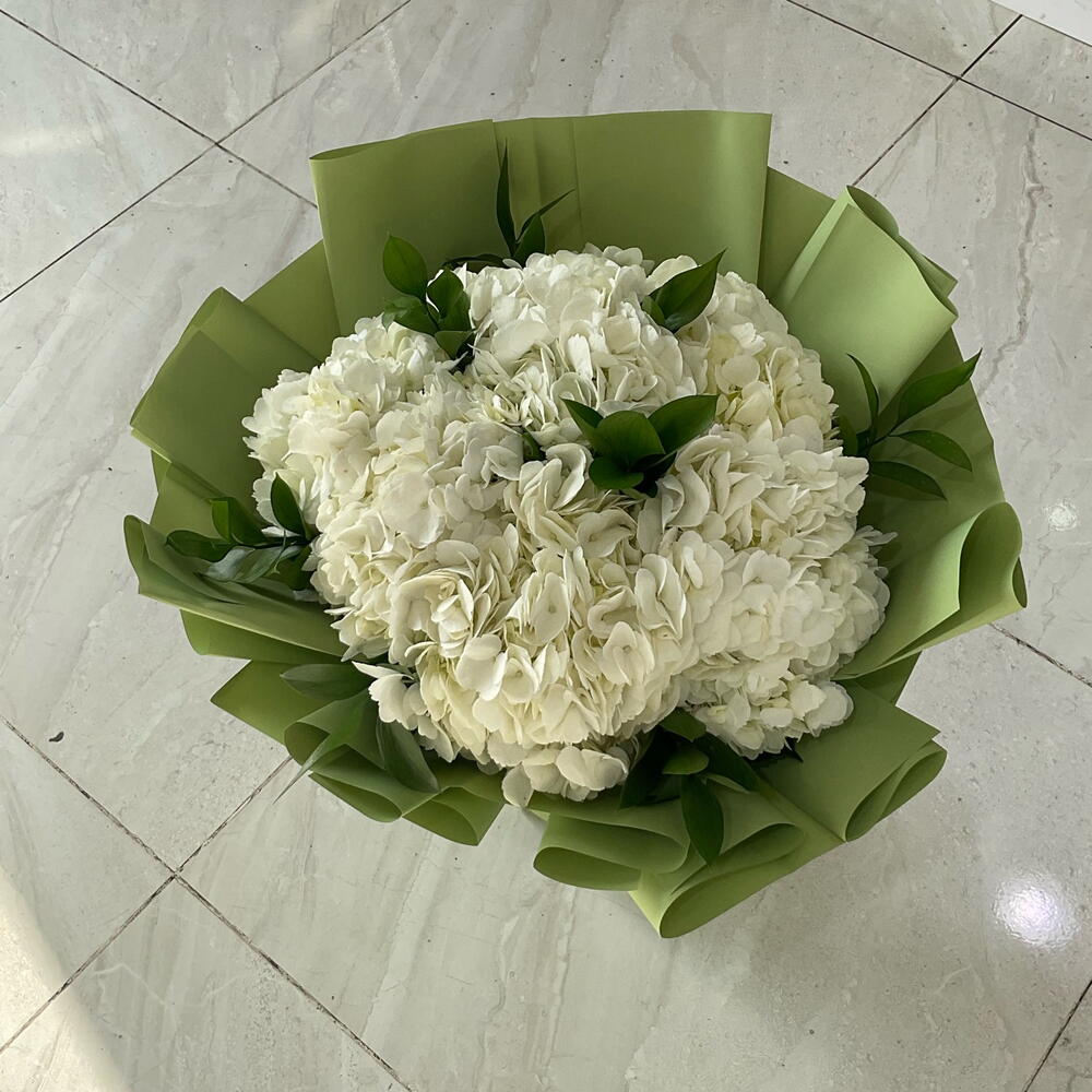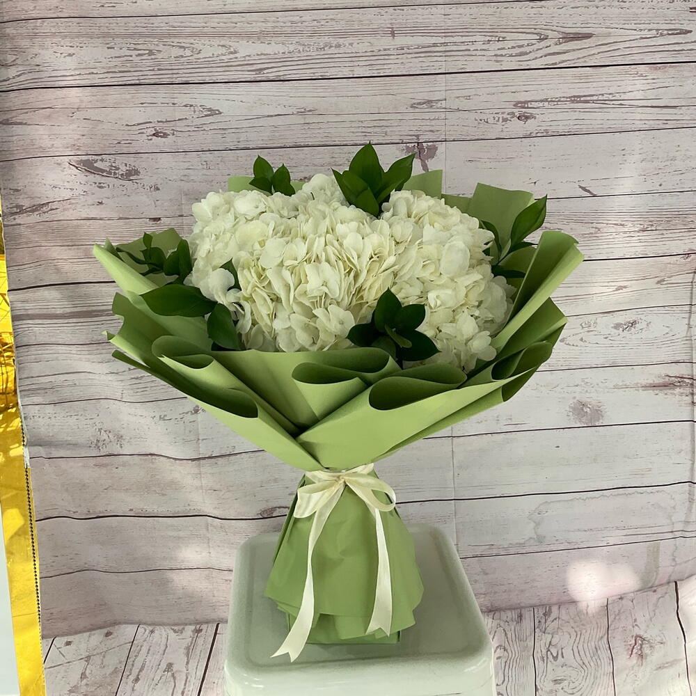 Ribbon - 1 шт. Ruscus - 6 шт. Hydrangea - 6 шт. paper - 8 шт.