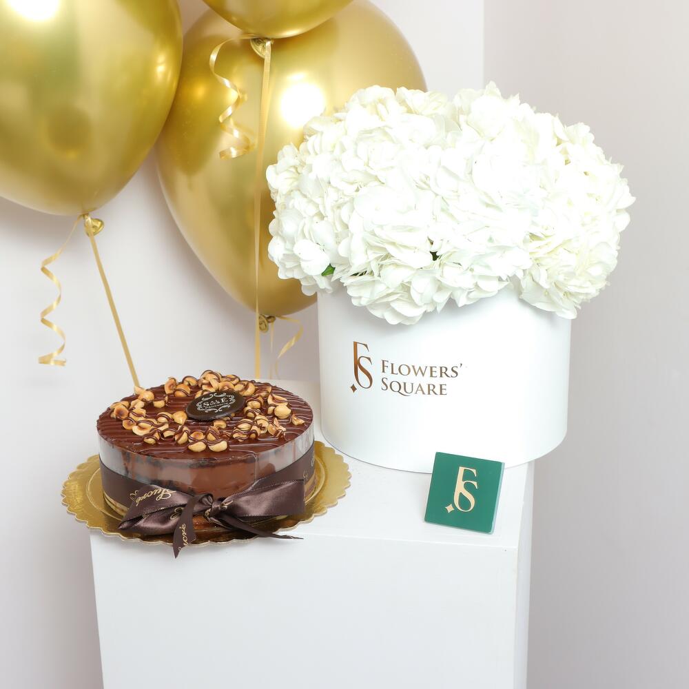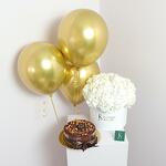 Удивите своих близких нашим специальным выгодным предложением! Наша коробка с гортензиями, ореховый фадж-кейк и 3 золотистых гелиевых шара сделают ваш праздник незабываемым. Сладкий и сливочный вкус орехового фадж-кейка, приготовленного из лучших ингредиентов, порадует вас, а золотистые гелиевые шары создадут воздушную атмосферу. Мы сделаем ваш праздник незабываемым!