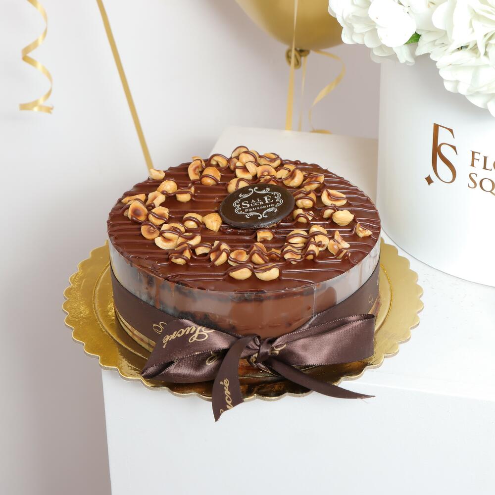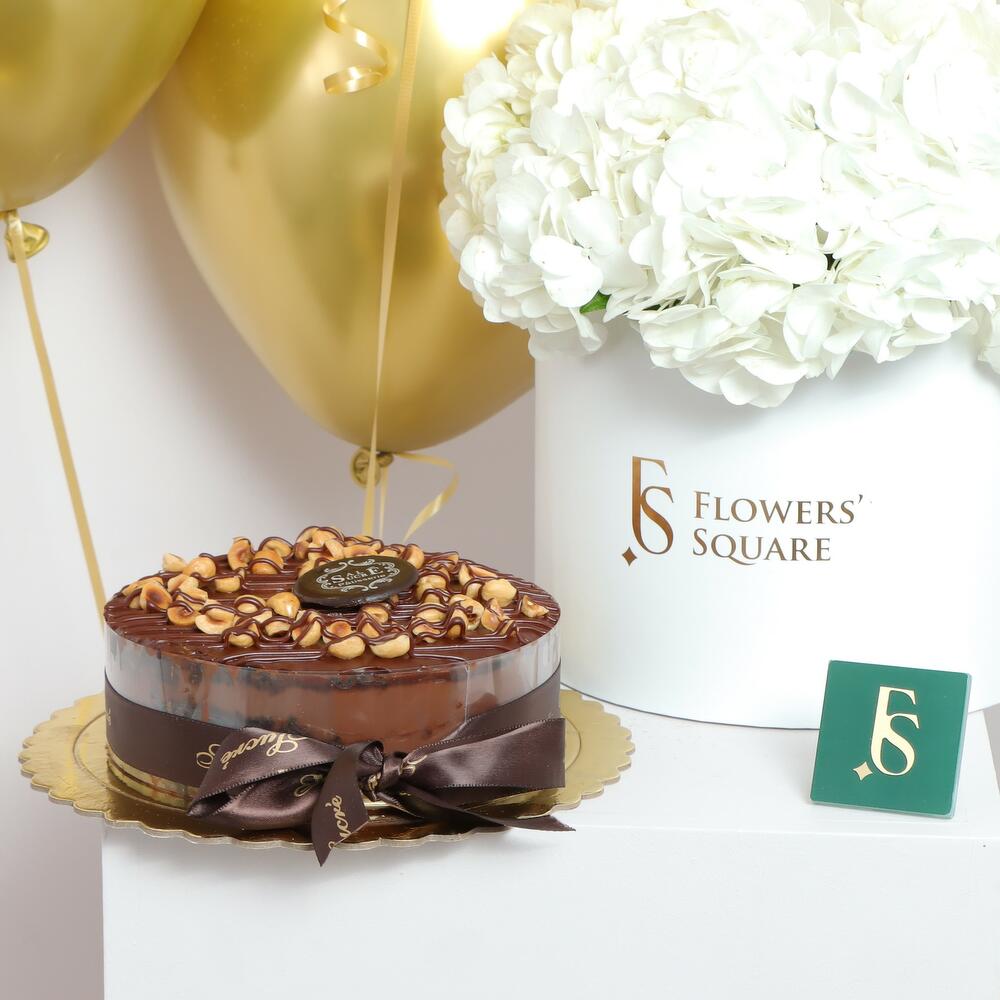 hydrangeas - 5 шт. фадж-торт с фундуком 750 граммов (6-8 человек) - 1 шт. большие золотые гелиевые шары - 3 шт.