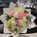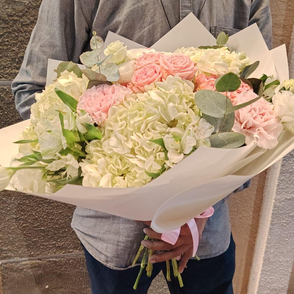 alstroemeria white - 3 шт. carnation pink - 3 шт. hydrangea white - 3 шт. lisianthus white - 3 шт. wrapping paper - 4 шт. eucalyptus leaves - 3 шт. бомбастичный розовый - 3 шт.