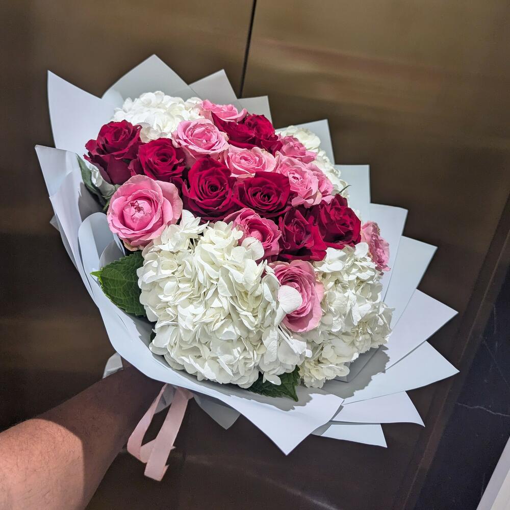 Red rose - 10 шт. Pink rose - 10 шт. white hydrangea - 4 шт.