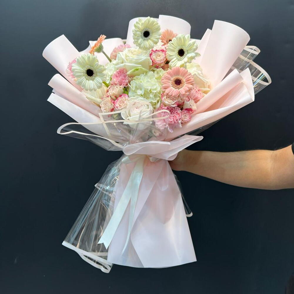 ГОРТЕНЗИЯ 1 ГЕРБЕРА 6 СПРЕЙ-РОЗА 3 РОЗА 3 ГВОЗДИКА 5 В БУКЕТЕ 300 AED..