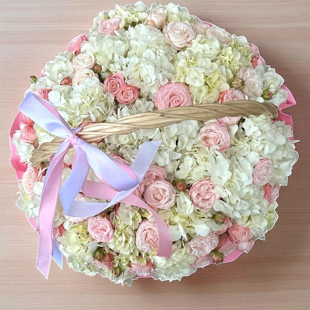 Гортензия, садовые розы, деревянная корзина, средняя