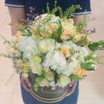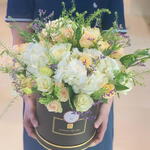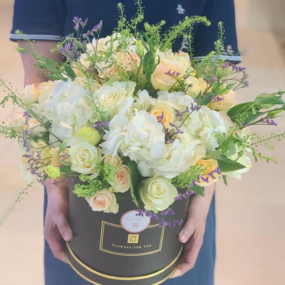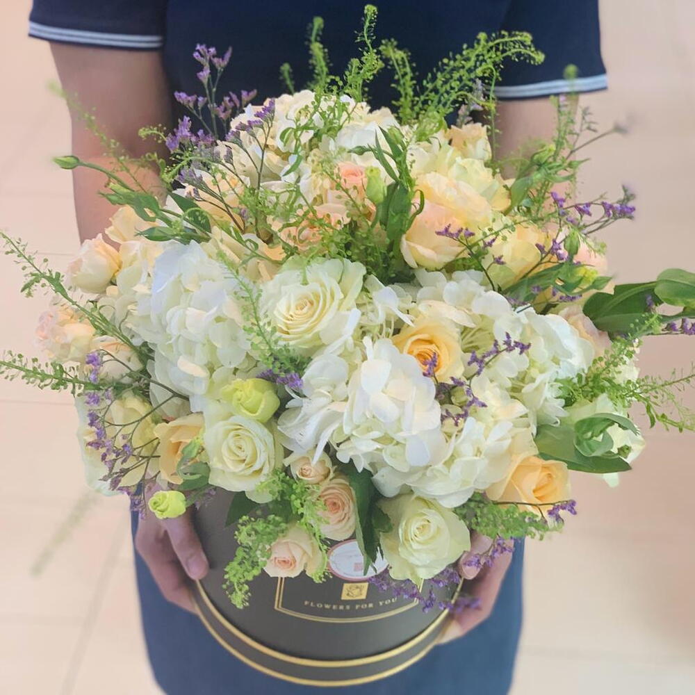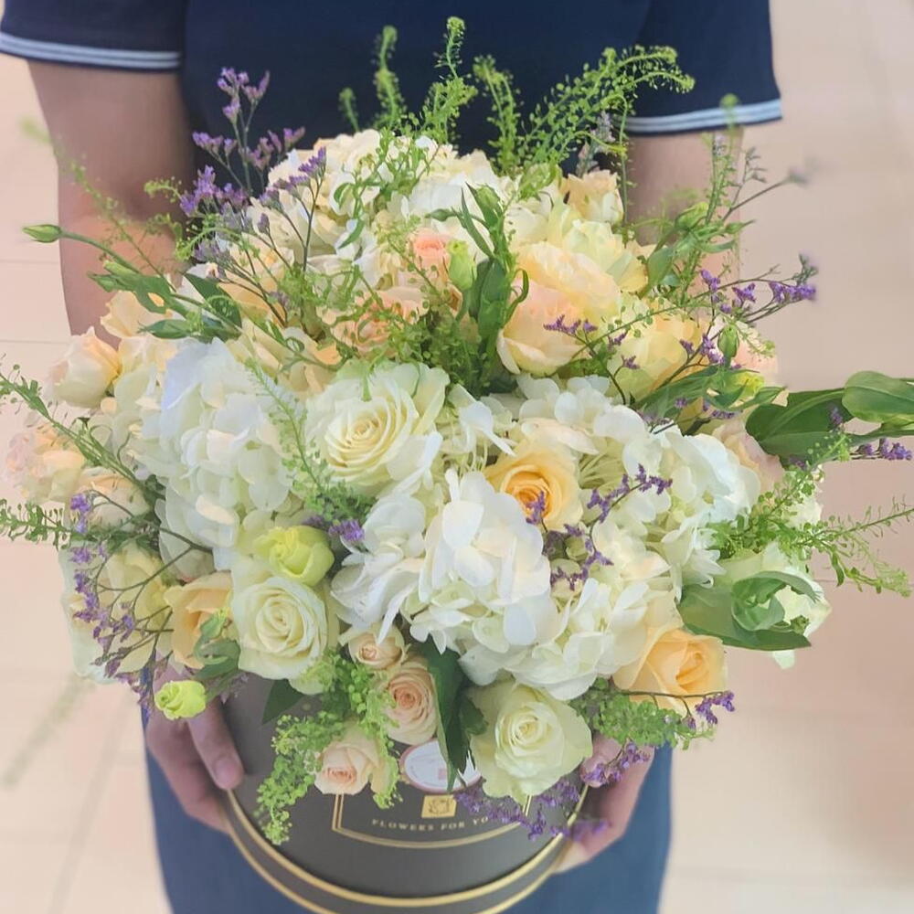 гортензия 3 микс роз 24 лизиантус 10 и спрей-розы 5 и аксессуары и коробка 500 AED