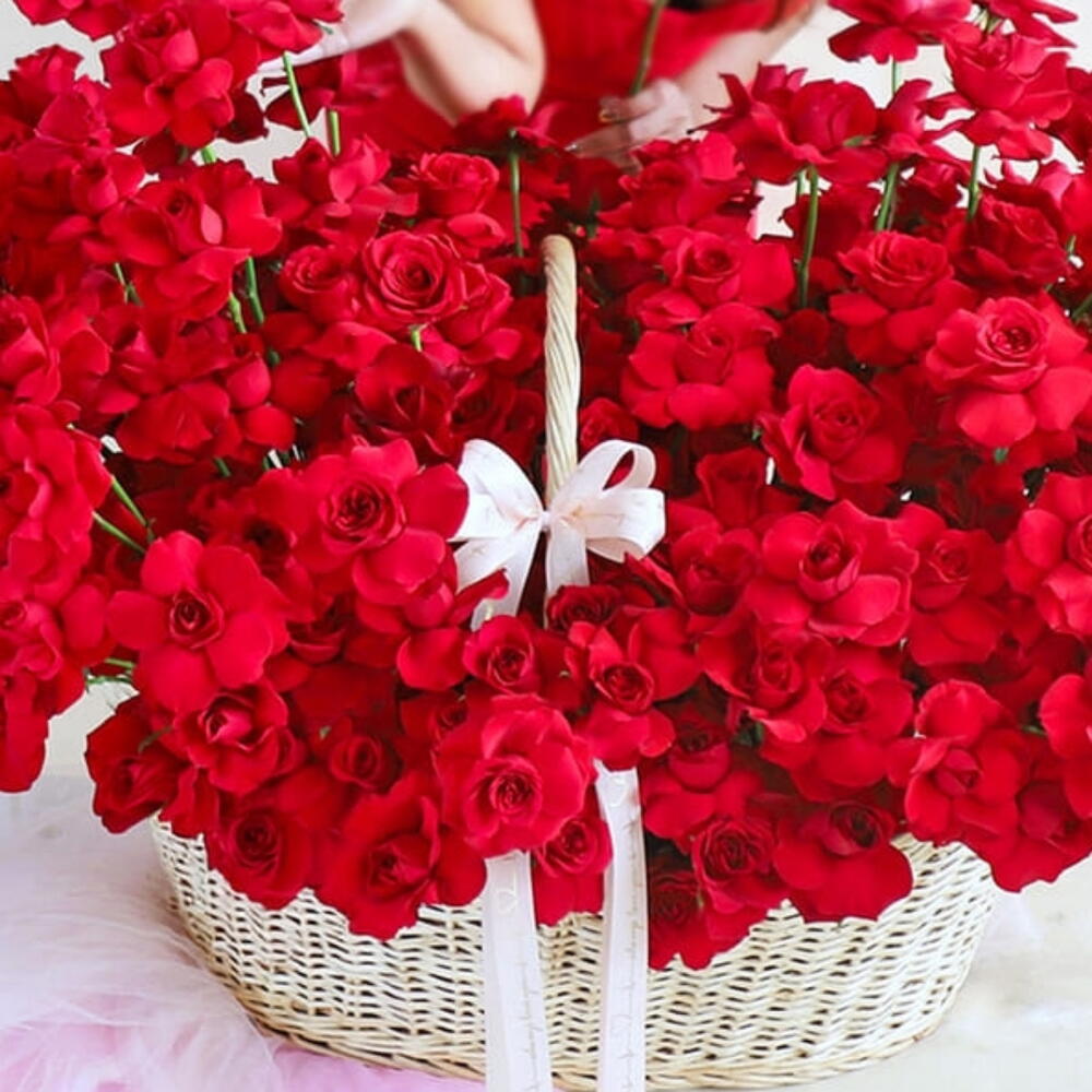Количество стеблей: 201 сияющая красная роза, каждая выбрана за свой яркий цвет и бархатистую текстуру. Композиция: Розы тщательно собраны в большую элегантную корзину с плетеной ручкой и красиво перевязаны белой лентой.