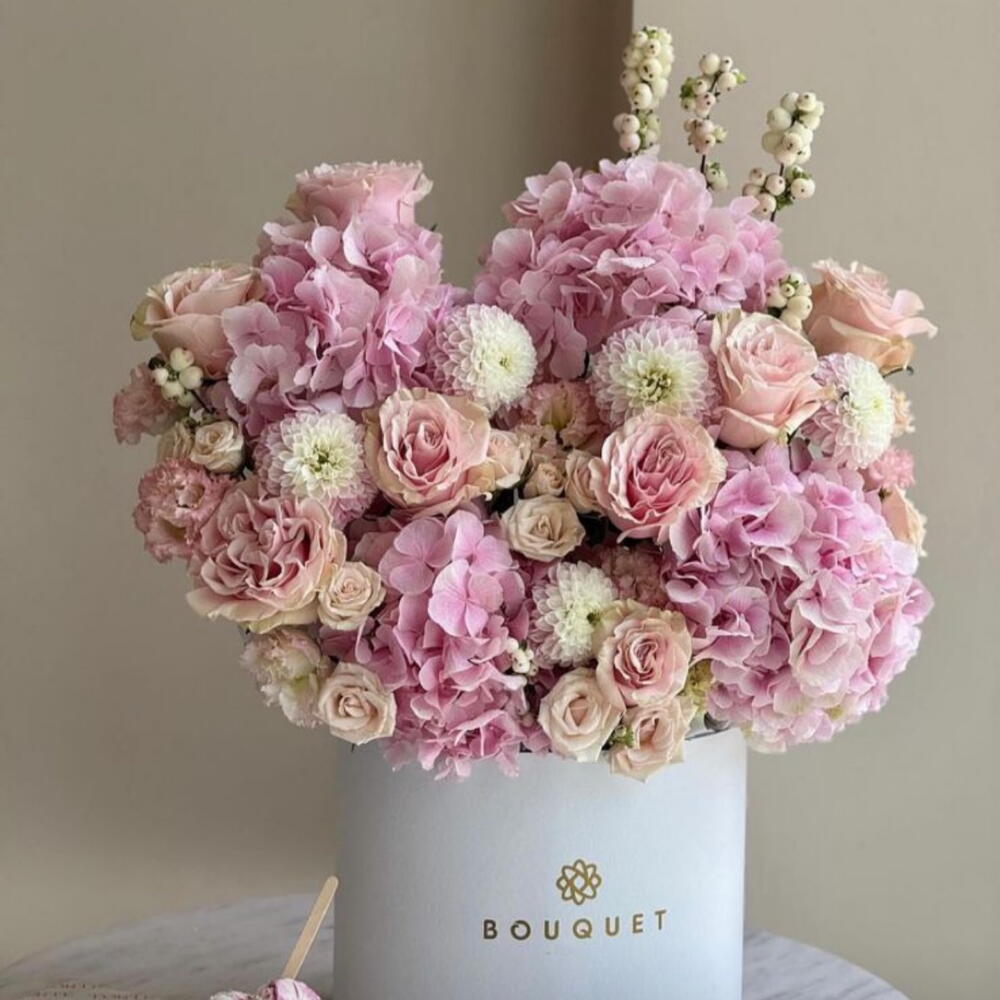Гортензия - 4 шт. Хризантема - 5 шт. Эустома - 3 шт. Коробка - 1 шт. розы - 9 шт.