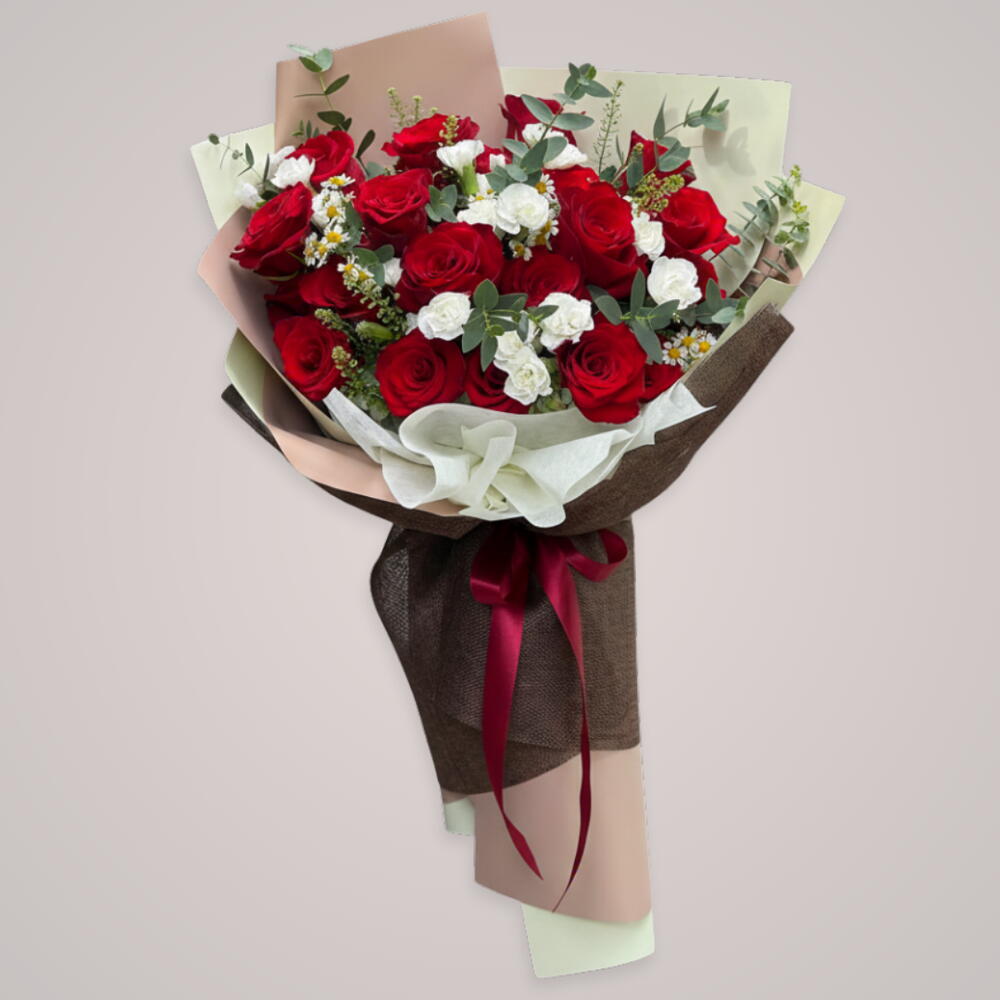 10 стеблей красной розы, 3 стебля белой мини-гвоздики, 3 стебля эвкалипта