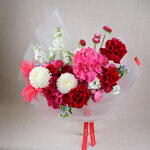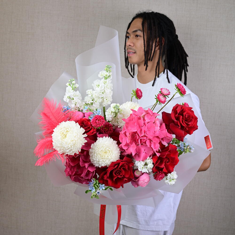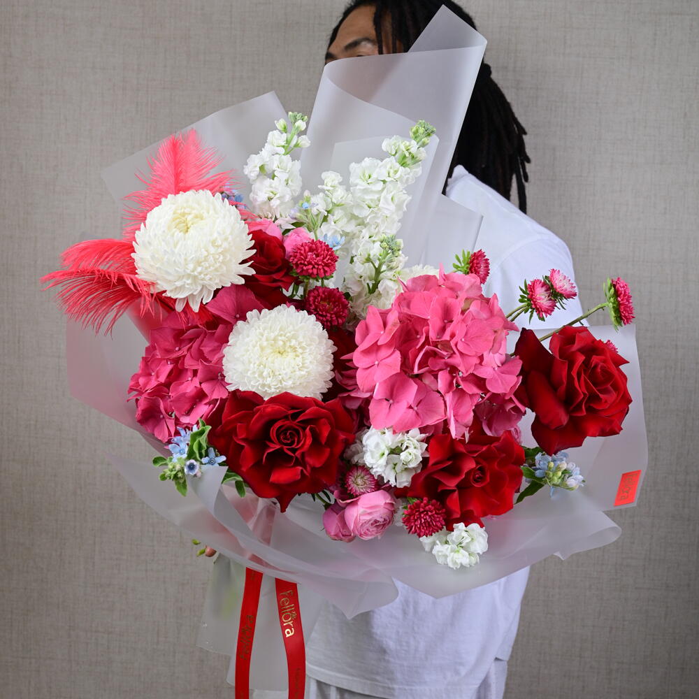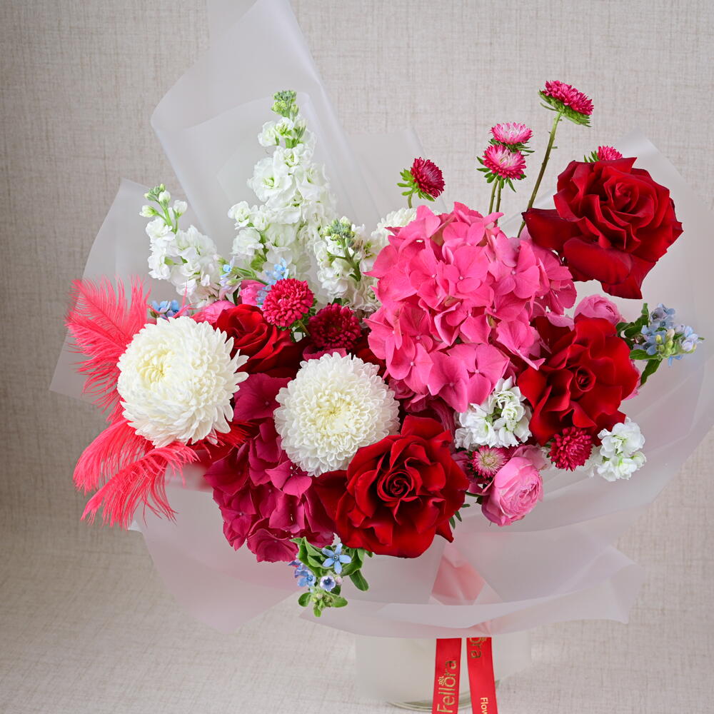 Окунитесь в мир пышной красоты и безмятежной элегантности с букетом «Невидимый сад» – потрясающим творением, созданным эксклюзивно для цветочного бутика Fellora Flower Boutique в Дубае. Эта изысканная композиция – воплощение лучших цветов природы, тщательно подобранных, чтобы подарить ощущение очарования и умиротворения. В букете три роскошные гортензии, которые добавляют нотку изысканности и объемного очарования. Три яркие хризантемы, дополненные тремя яркими хризантемами, привносят в композицию буйство красок и жизненную силу. Пять классических роз символизируют глубокую любовь и восхищение, а пять роскошных пионовидных роз дополняют композицию своими пышными, пышными цветами и пленительным ароматом. Пять нежных цветков маттиолы добавляют изящества и элегантности, дополняясь тремя причудливыми оксипеталумами и тремя яркими каллистефусами, которые вместе наполняют букет динамичной палитрой и ноткой причудливости. Добавление четырёх нежных перьев придаёт композиции неповторимую, неземную нотку, создавая ощущение лёгкости и безмятежности. Букет «Невидимый сад» идеально подходит для любого особого случая и является потрясающим воплощением красоты и изысканности. Будь то трогательный подарок любимому человеку или роскошный подарок себе, пусть этот букет превратит ваше пространство в оазис элегантности и спокойствия, наполняя его атмосферой чистого блаженства и гармонии.