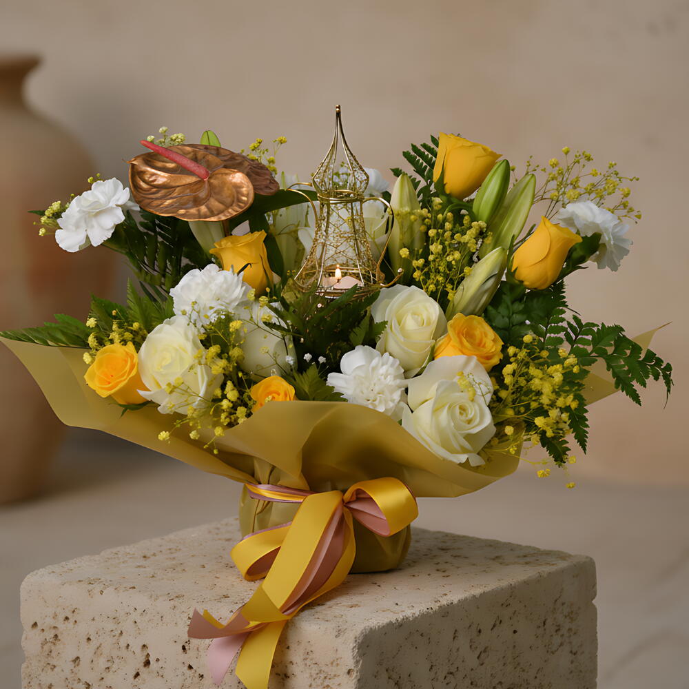 Изысканный и сияющий, Itqan — выразительный букет, который воспевает баланс, мастерство и свет. Желтые и белые цветы уложены слоями с мягкими фактурами и золотыми акцентами, завершённые светящимся свечным фонарём — композиция, которая кажется щедрой, воодушевляющей и прекрасно созвучной духу Рамадана.