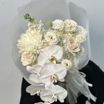 Этот элегантный букет демонстрирует спокойную смесь полностью белых цветов, включая нежную маттиолу, изящную хризантему деко и пышные гортензии. Белые розы Охара придают изысканность, а один стебель орхидеи фаленопсис добавляет нотку экзотической красоты. В сочетании с белым лизиантусом этот букет источает чистоту и грацию, завернут в простую, но утончённую прозрачную белую ткань. Идеально подходит для любого повода, он излучает неподвластную времени элегантность.