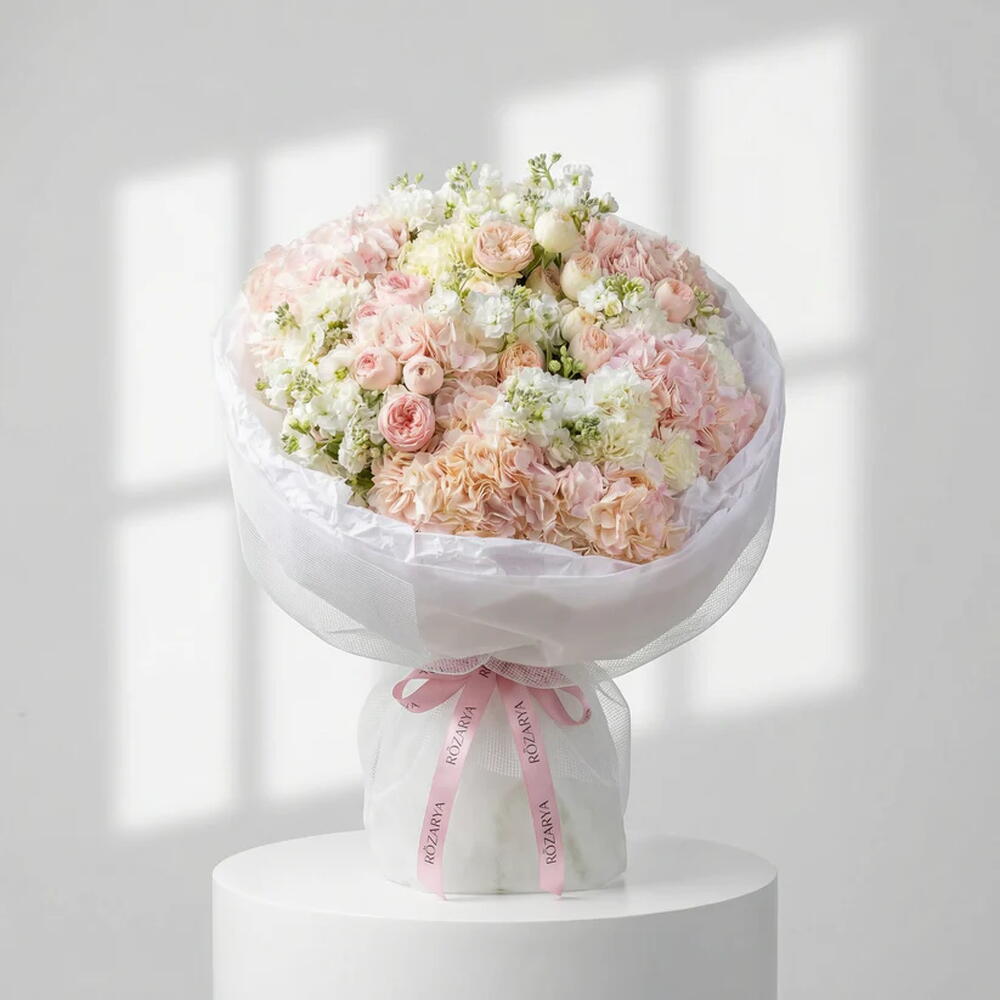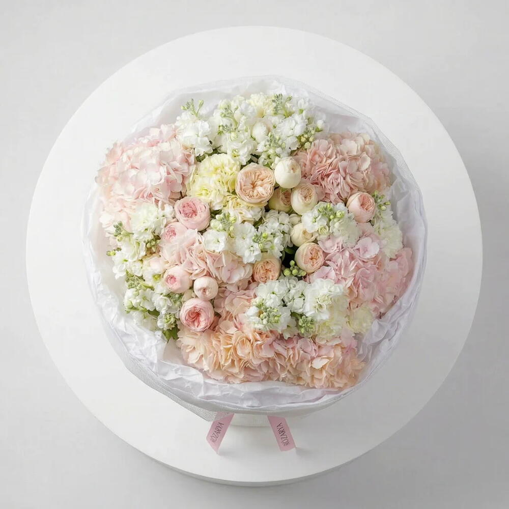 A lush bouquet in delicate blush and white shades, arranged with soft hydrangea, elegant spray roses, ranunculus, and white matthiola, romantic, and refined, this bouquet is a beautiful choice for birthdays, Mother’s Day, and special celebrations. • Please Note: As flowers are natural products, actual colors may vary slightly from digital images due to seasonal growth and lighting conditions. We guarantee that the overall style and premium quality as well as freshness of your arrangement will always be maintained.