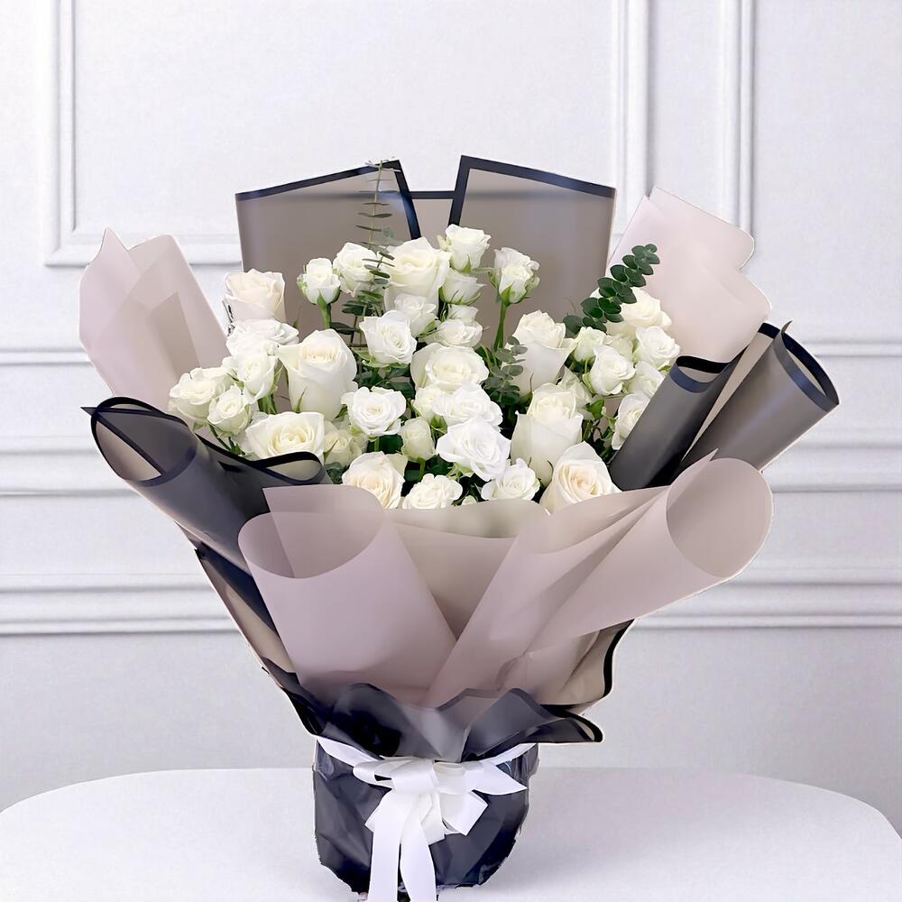 “Элегантность слоновой кости” — утончённый и вневременной букет белых роз и эвкалипта, оформленный в изысканной палитре чёрных и нюдовых тонов. Символизируя чистоту, восхищение и грацию, этот букет идеально подходит для свадеб, годовщин или искренних соболезнований.