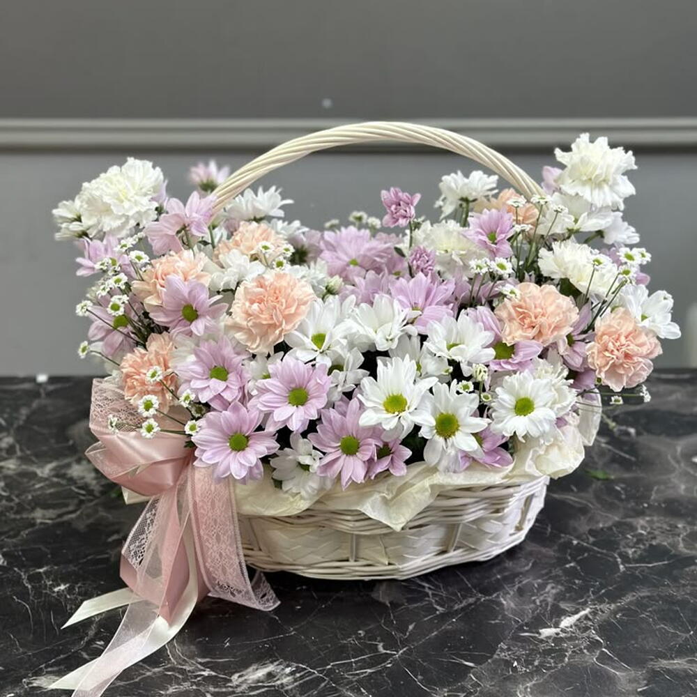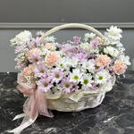 Basket - 1 шт. хризантема белая - 4 шт. белая астра - 3 шт. гвоздика розовая белая - 12 шт. розовая хризантема - 3 шт.