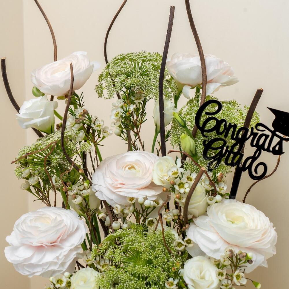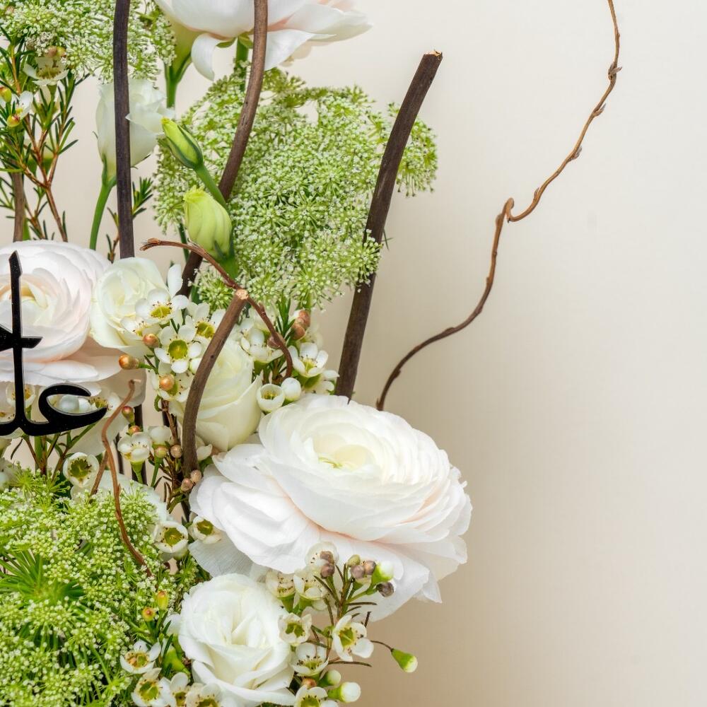 Spray rose - 4 шт. Wax flower - 3 шт. микс наполнителей - 2 шт. полевой цветок типа кружева королевы Анны или аналогичный - 3 шт. rananculus - 5 шт.