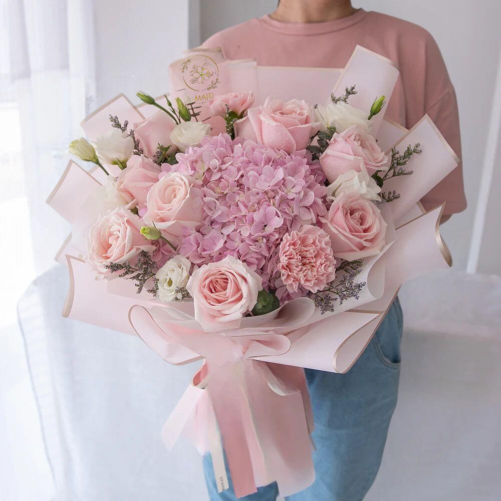 Gypsophila - 10 шт. hydrangea purple - 2 шт. гвоздики розовые - 5 шт. pink roses - 10 шт. белые беби-розы - 10 шт. lavender statice - 8 шт.