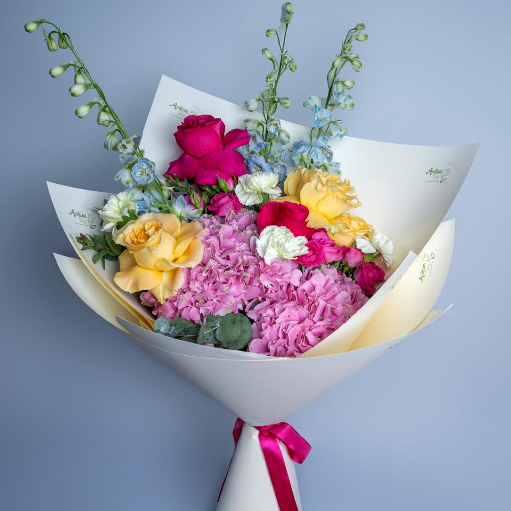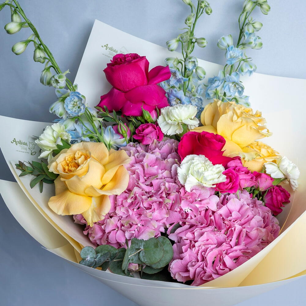 Ribbon - 1 шт. Spray rose - 2 шт. Yellow rose - 3 шт. carnation - 5 шт. delphinium - 3 шт. eucalyptus leaves - 3 шт. hydreangea - 2 шт. натуральная обёрточная бумага - 5 шт. фуксиево-розовая роза - 2 шт.