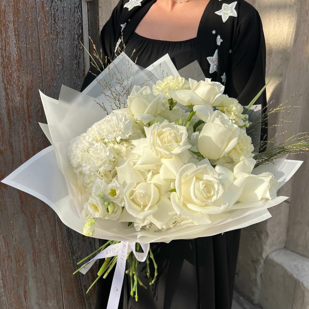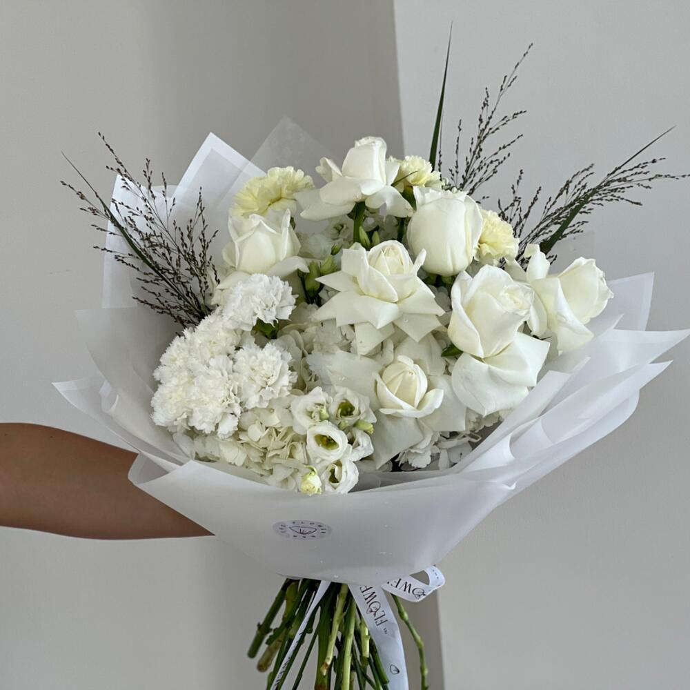 Wrapping - 1 шт. Eustoma white - 3 шт. rose white - 7 шт. carnation white - 3 шт. hydrangea white - 5 шт. panicum - 3 шт. маттиола белая - 3 шт. гвоздика гермес - 3 шт.