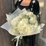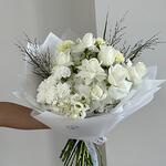 Пышный букет с миксом белых цветов — 5 белых роз, 8 белых гвоздик, 5 гортензий, 3 маттиолы и 3 лизиантуса. На подготовку этого букета потребуется дополнительно 15 минут.