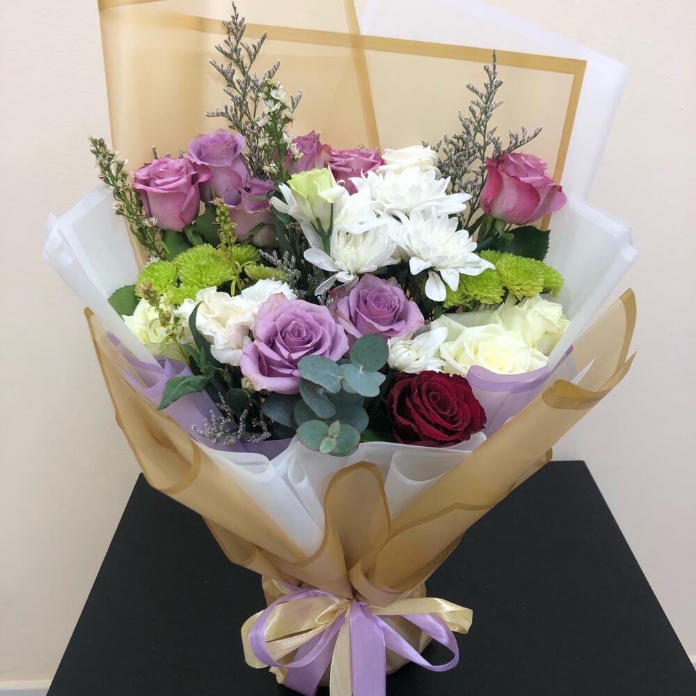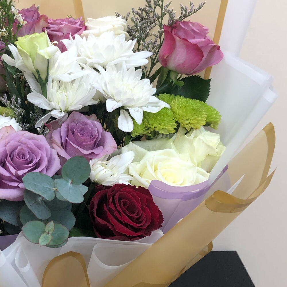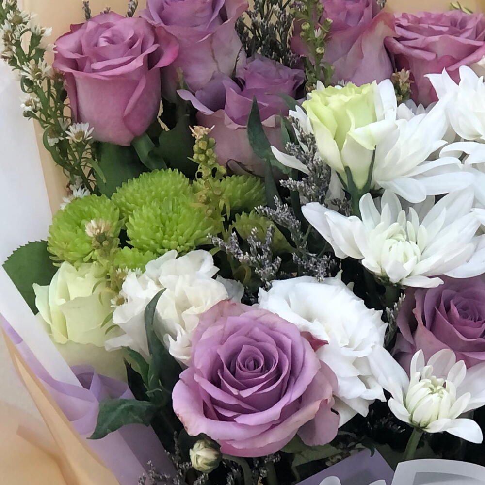 Откройте для себя вечную красоту с нашей изысканной композицией Florists Special. Этот очаровательный букет представляет собой элегантное изящество трёх белых роз, гармонично сочетающихся с восемью великолепными фиолетовыми розами. Этот цветочный микс дополняют четыре сегмента пленительного фиолетового лимониума и два цветка безупречно белого крезентмума. Для идеального обрамления этой композиции мы выбрали два зелёных бересклета, которые придают композиции яркую свежесть. Эта цветочная композиция идеально подходит для любого случая – будь то щедрый жест любви, сокровенное послание надежды или искренний символ благодарности. Превратите свои чувства в цветущую поэзию с помощью нашей тщательно продуманной композиции Florists Special.