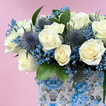 eryngium blue - 3 шт. spray rose white - 5 шт. синяя гипсофила - 3 шт. белая роза - 8 шт.