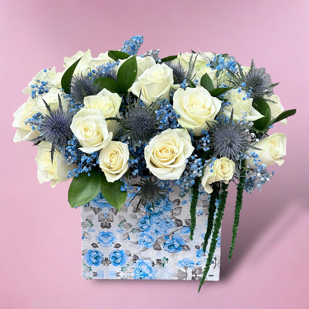 eryngium blue - 3 шт. spray rose white - 5 шт. синяя гипсофила - 3 шт. белая роза - 8 шт.