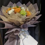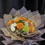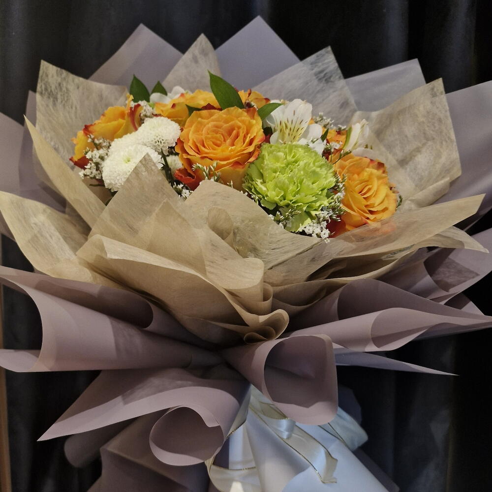 alstroemeria white - 2 шт. santini yellow - 1 шт. лимониум белый - 4 шт. тяжёлый - 3 шт. оранжевые розы - 9 шт. гвоздика белая и зелёная - 3 шт. белый бутон - 1 шт.