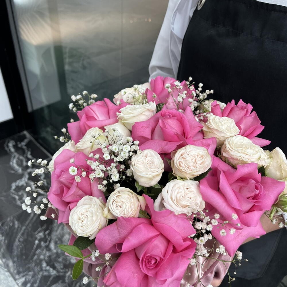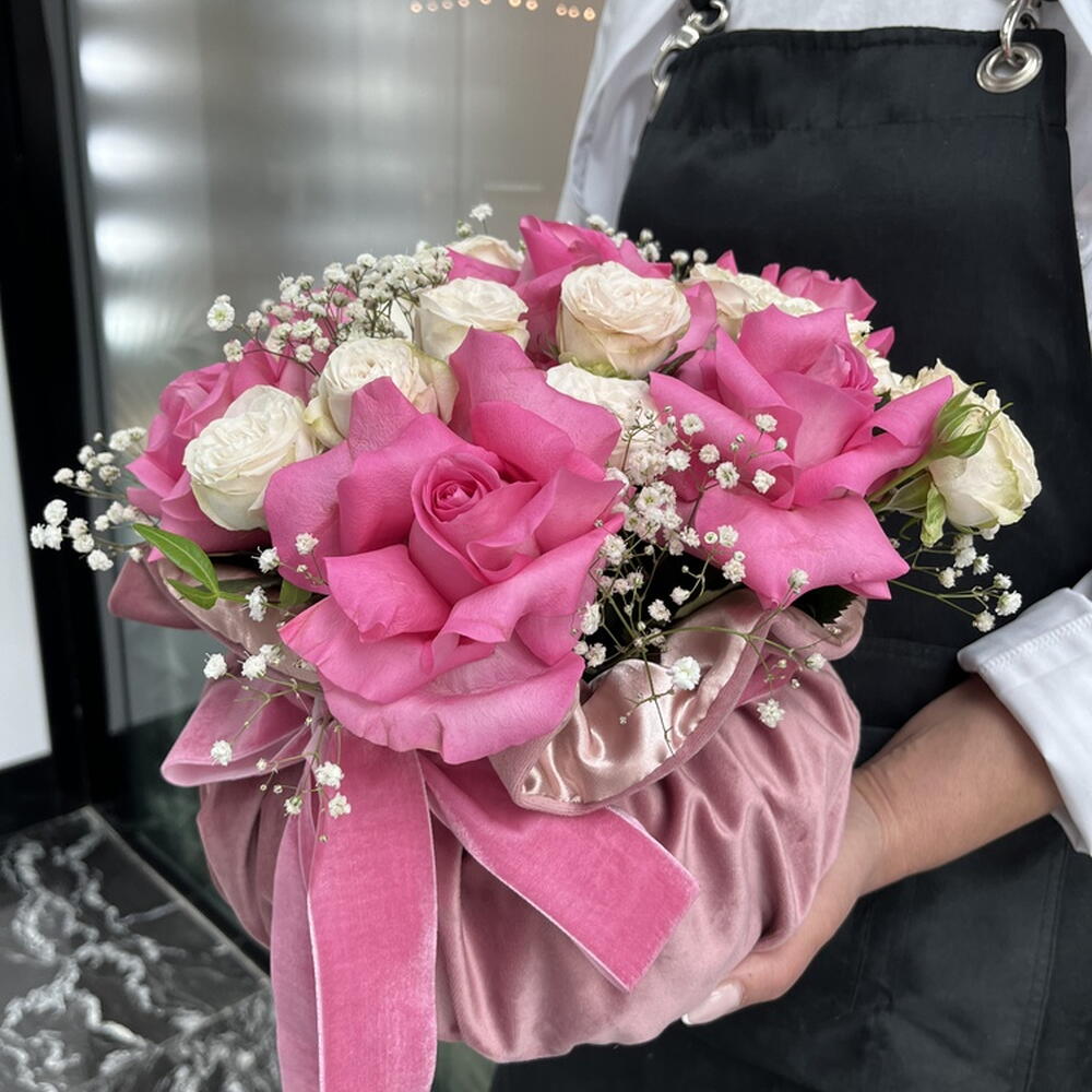 Composition: Rose pink - 7, Rose spray Bombastic - 3, Gypsophila - 2, Velvet pouch bag - 1 Sizes: WIDTH - 20CM; HEIGHT - 25CM; LENGTH - 25CM; (including packaging) Размер: 20 x 25 x 25 см
